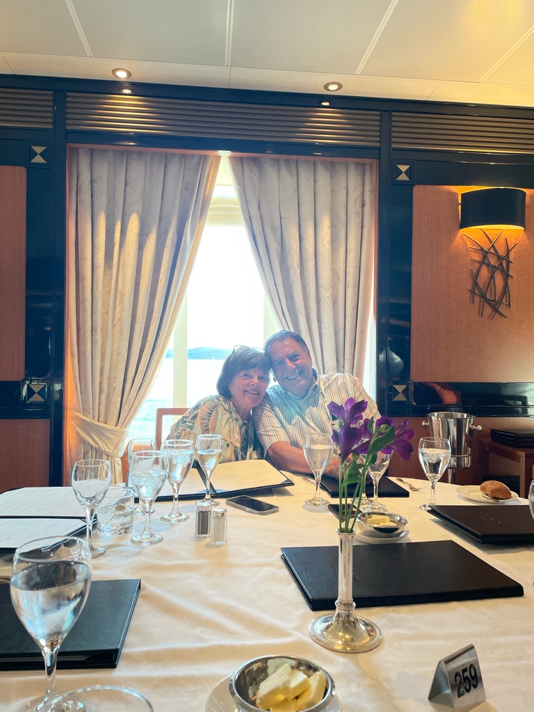 We met before dinner at the Crown Bar, then proceeded to the dining room for our 7:20 reservation. The sun shone through our window, a rainbow appeared (must get the photo from Katie). Dinner was fun, Wyatt announced he was tired after eating, a huge day for him, quickly crawled under the table and slept. The kids, Ruby and Foster, in search for a bathroom, got lost, Nia found them…..a lesson learned. Dinner was delicious-sleep beckoned us. Chris carried Wyatt to bed, the kids swam, we said goodnight. Tomorrow night, the adults will sit closer together, with Wyatt close by. A great day!