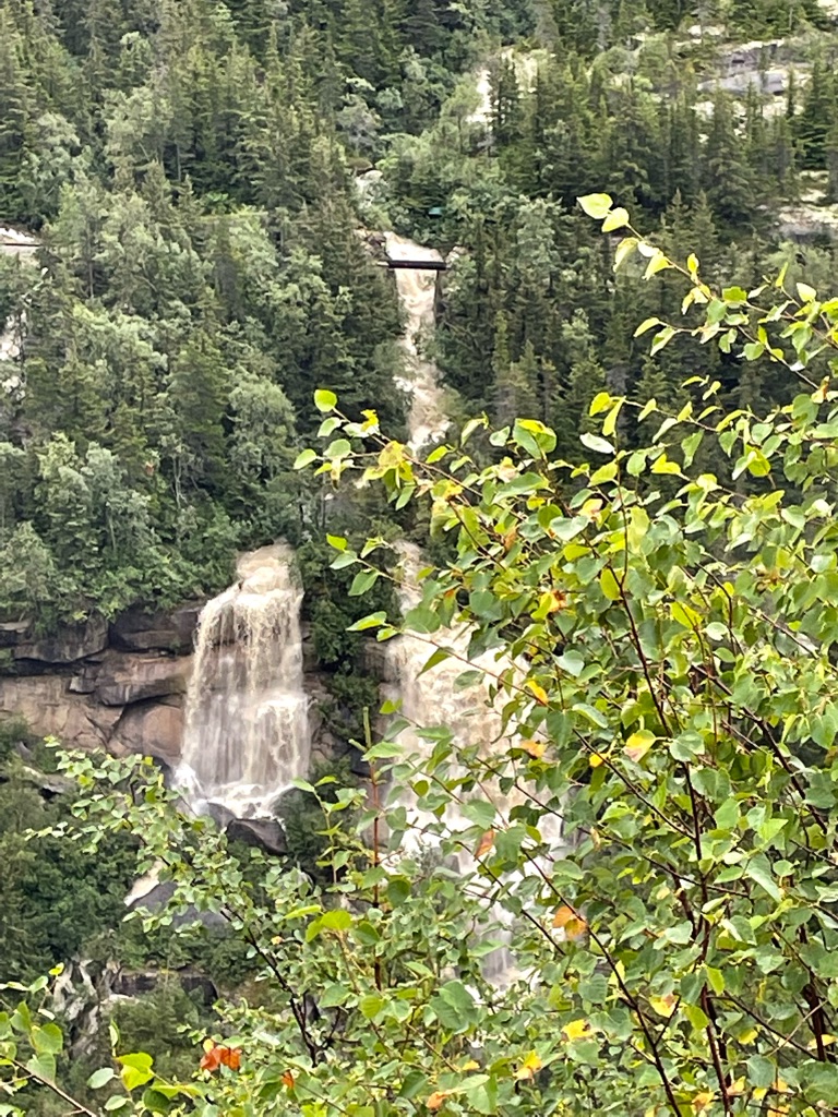 Around noon the wind calmed and we were told all was back on. Our tour was a go! \240We hustled to gather and get ready for our trip up to the Summit and the Canadian U.S. border at the Yukon. We were tendered in to the main harbour where we met Andy (looked like Ted Lasso) our driver and guide. The rain stopped and the sun began to appear. Our family previously decided to take a small bus versus the train because it would be making stops along the way; the vintage trains (White Pass and Yukon Railroad) are scenic tours only, a ride through history. Good decision, the train was cancelled, again rocks on the tracks. Apparently this is a common problem.