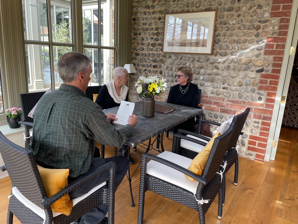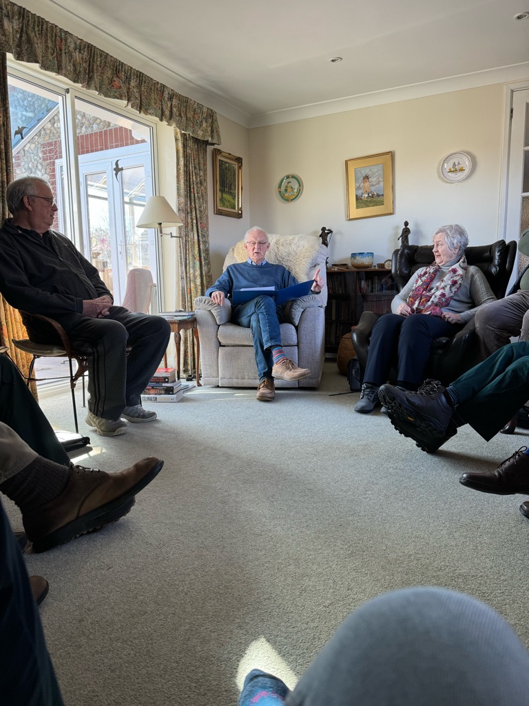 On day two, Vic and Jen invited me over to their house, only a 10 minute drive away, to attend their quarterly Ramblers meeting. \240Vic and Jen have been super active with the Ramblers for decades. They alternate between a weekly hike on either a Wednesday (about 5 miles) or Saturday (longer walks 6 to 8 miles). \240Their chapter has about 90 members. They usually get about 25 or so on each walk. \240This meeting was to plan the walk leaders for the next 3 months. The leaders are responsible for pre-walking the planned hike to make sure it is passable, talk to local farmers regarding access through their fields, make sure adequate parking etc. etc. \240Sounds like a lot of work to me! \240I learned about the most interesting app called What Three Words. \240The Ramblers use this app to inform each member about the starting point of each hike. \240As this is a very rural area it is difficult to just give an address! \240The entire country (not sure if this is world wide) is mapped and charted into 3 meter squares and each given a 3 word code. \240If you go to the app and enter those 3 words it will give you the exact directions to the start of the walk. Isn’t that incredible?!! \240For instance, my house here in Blakeney is at “craftsmen collapsed fenced”. \240If you have this app you can enter those words and it will show you exactly where Im sitting 😁