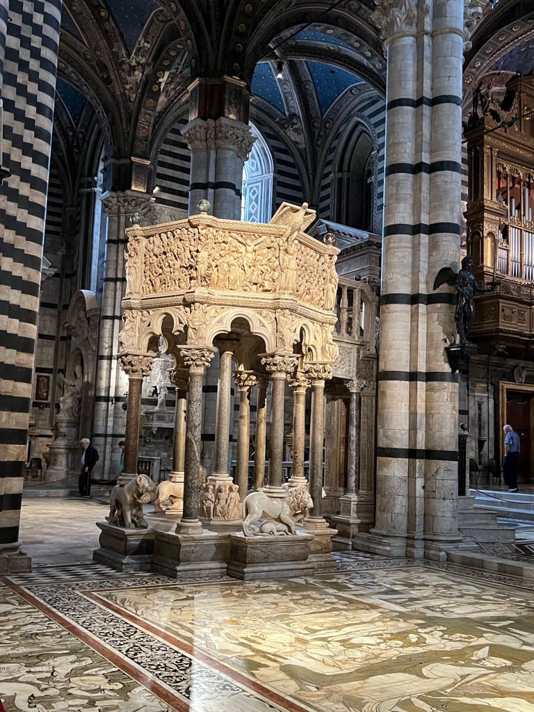 The pulpit is intricately engraved and sits on an equally beautiful enlayed floor depicting biblical scenes.