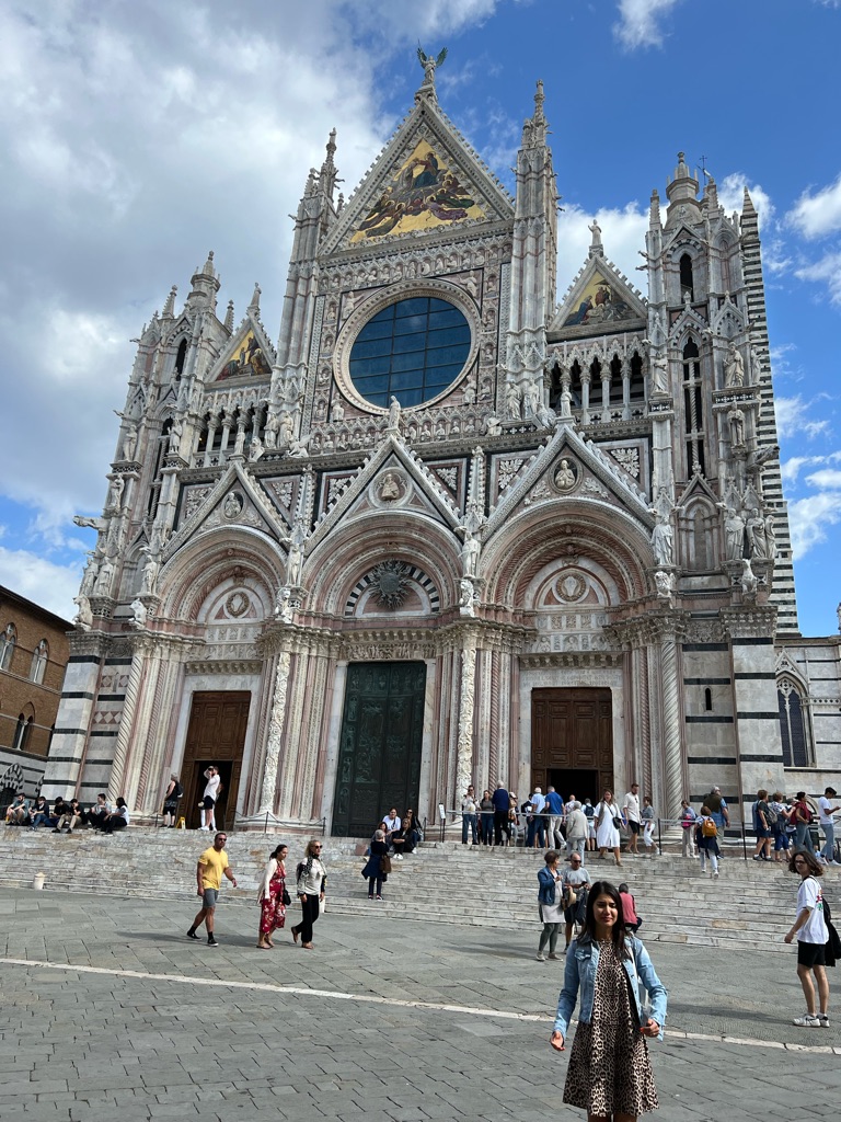 The Duomo of Siena was designed and completed between 1215 and 1263 on the site of an earlier structure. It has the form of a Latin cross with a slightly projecting transept, a dome and a bell tower.