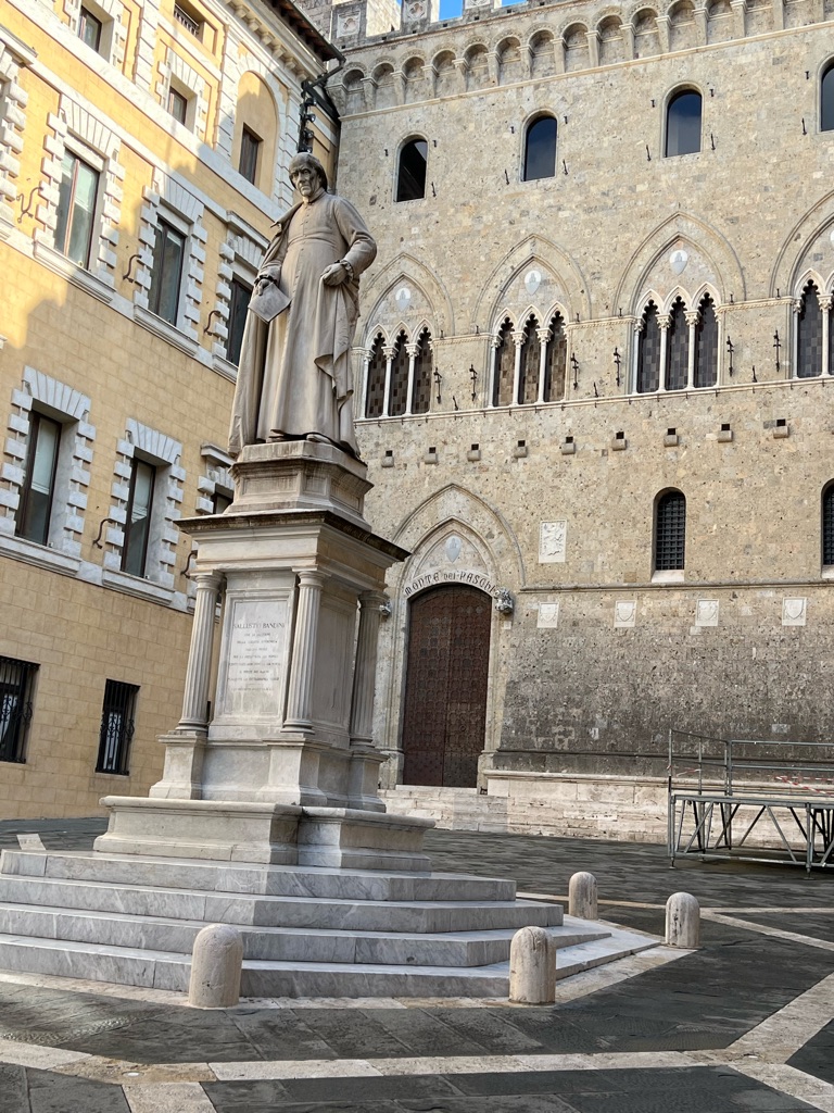 The painter Signe do Bonaventura is revered in the square that celebrates the oldest bank in the world. Started as a pawn shop in 1472, the month Del Peschi is still in operation today as the 3rd largest bank in Italy.