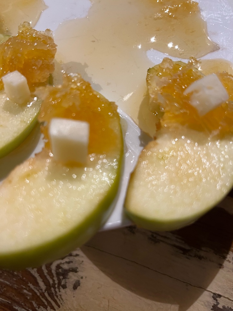 An idea for a cheeseboard apple or pear slice with honey and a little bit of cheese