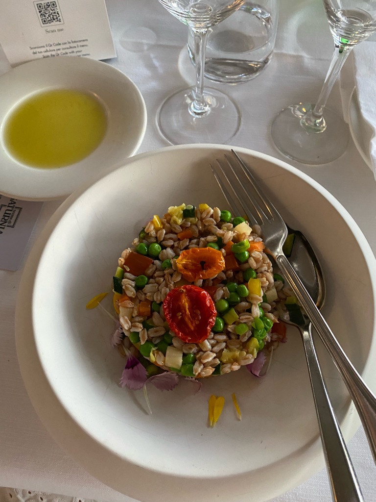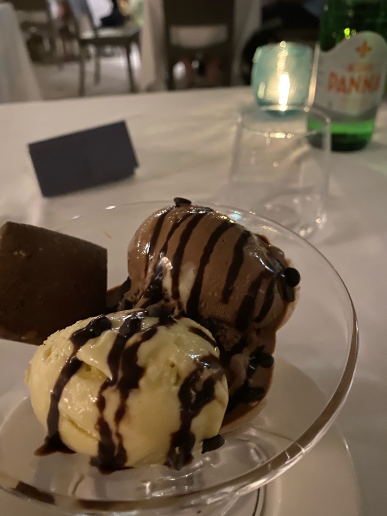 At dinner the meal began with welcome champagne from the area and an appetizer of salmon and mango. Following this I ordered a vegatable starter and an entree of gluten free pasta with pesto and baked ricotta. For dessert the chef recommended the homemade gelato in the flavors of Catalan Creme and Chocolate.