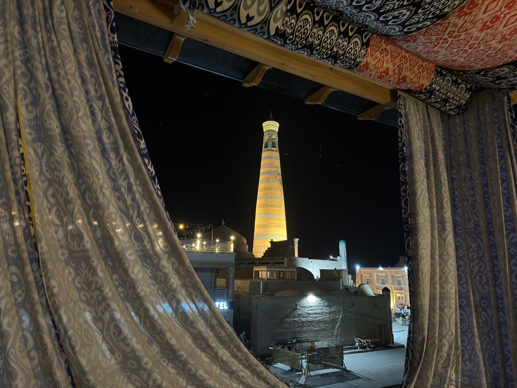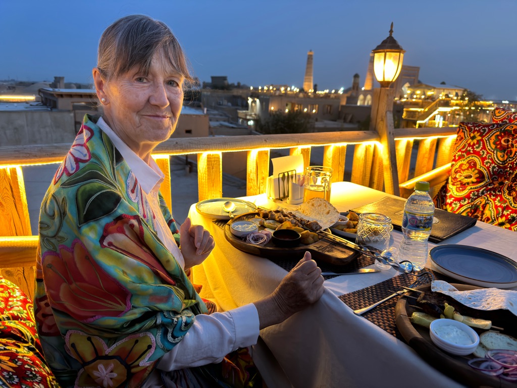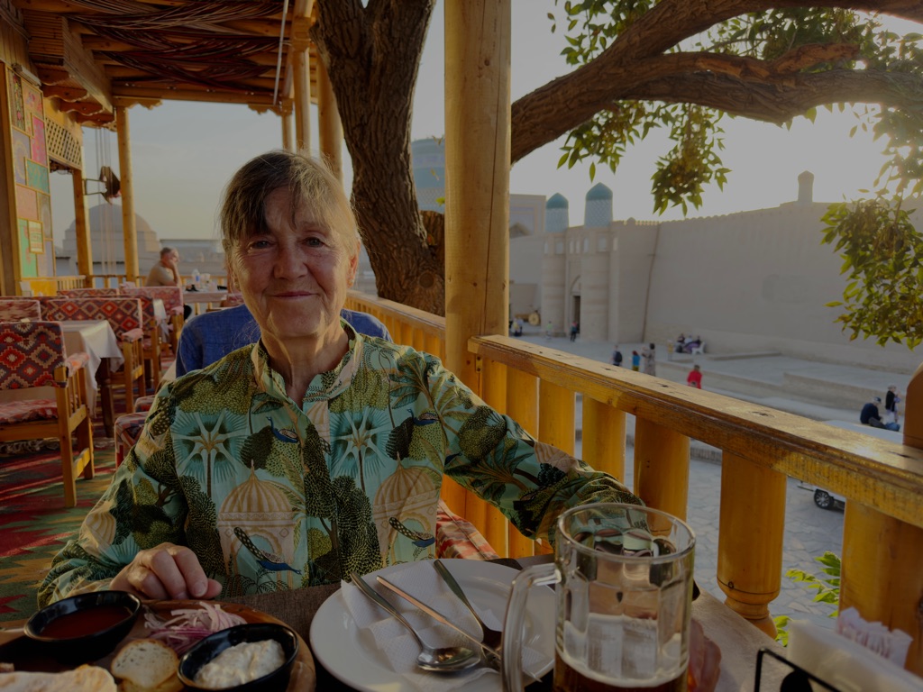 We went out on our own, navigated the menu but when we ordered in addition two beers we were ushered out of the main dining room into a back room!! It was a lovely meal lamb kebabs plus two each of \240monstrous tomatoes and rice. The beers cost 100,000 som! A total bill of £11 more than half going on the beer. The waiter even took a clandestine photo of our dreadful behaviour. What a laugh it felt like the prohibition. It has been a naughty but nice day food wise just had cake for lunch, a chocolate one and a pistachio one and iced tea which was actually a cup on cold black coffee.