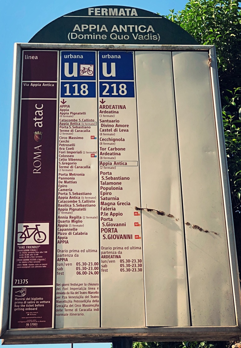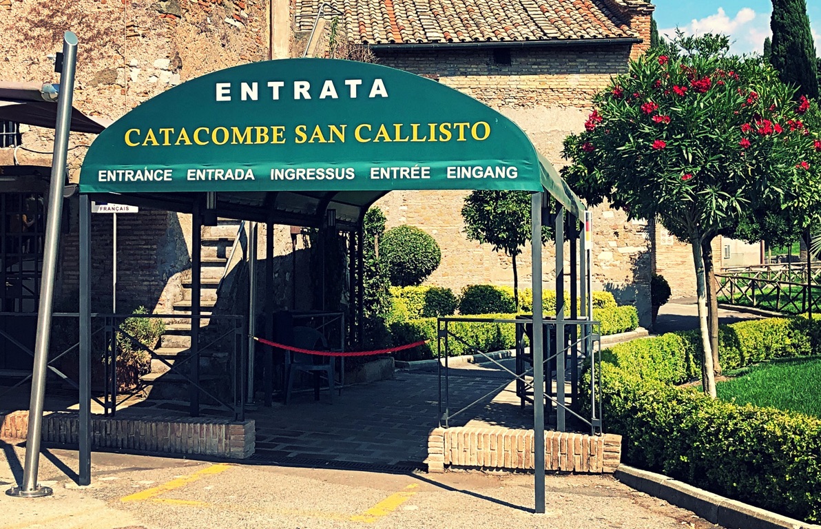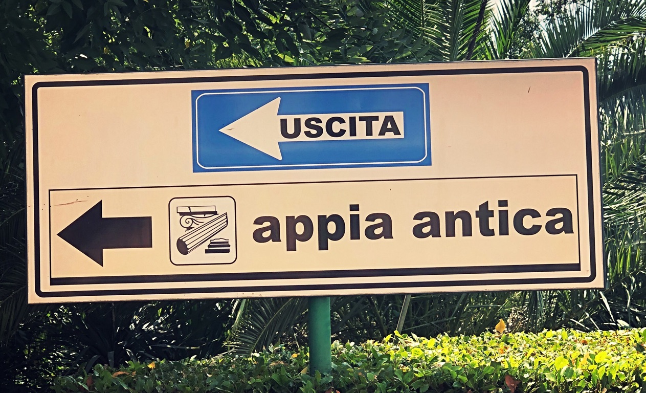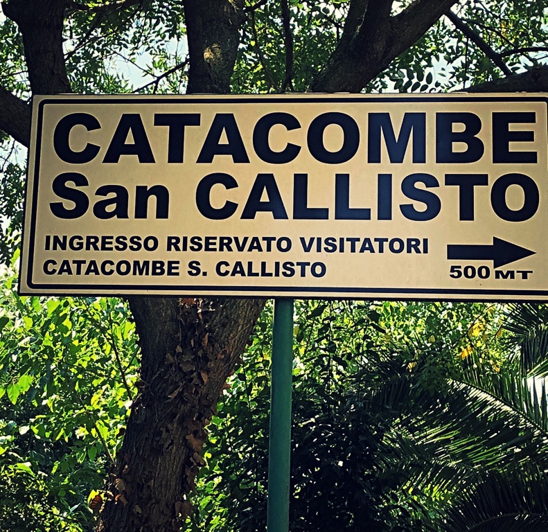 Sign along the Appian Way helping travelers find their way to the Catacombs of San Callisto.