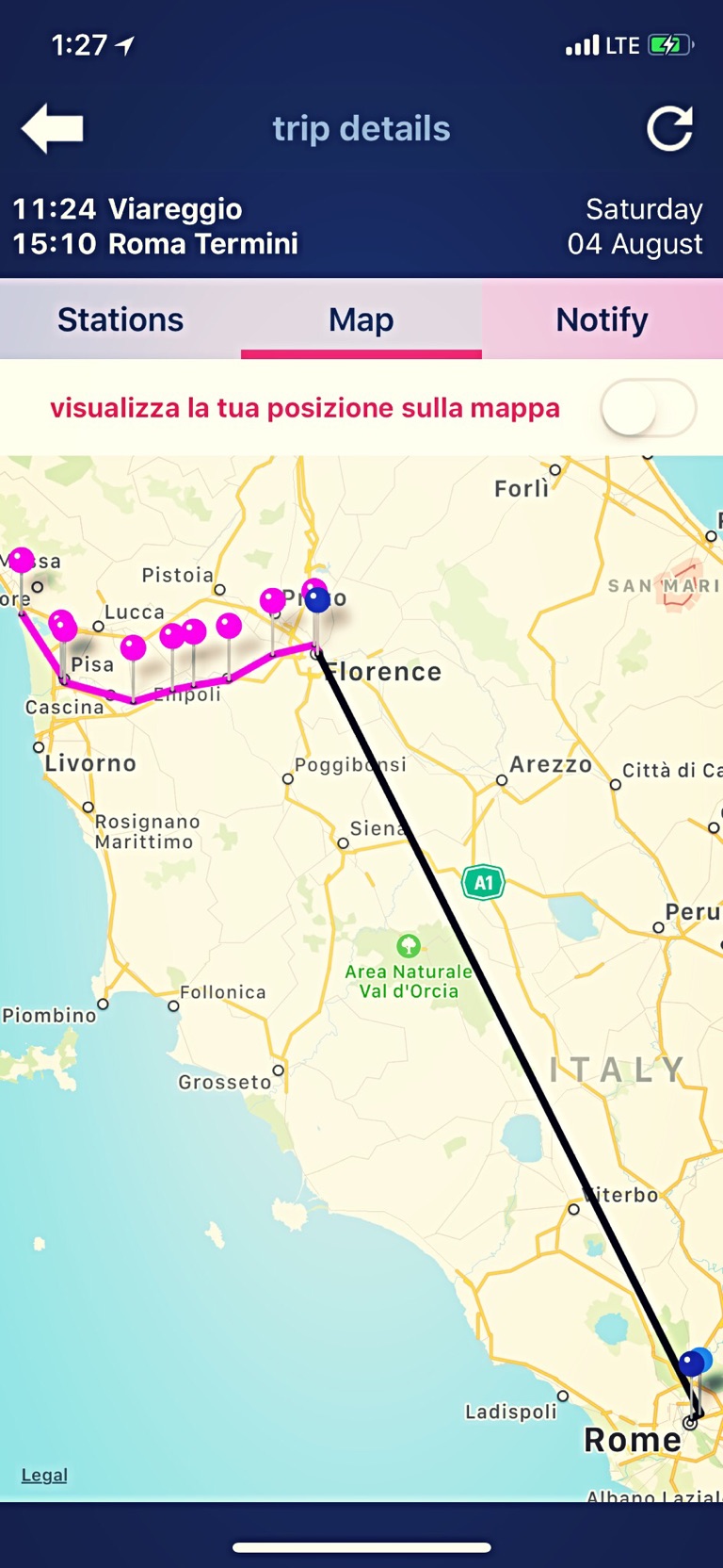 After many multiple train stops on other days, I loved seeing this map of my last train ride non stop to Rome today! Also... such a sleek, beautiful train!