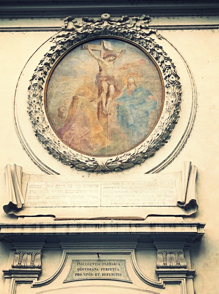 The Catholic Church that the pope required the Jewish community to worship in beginning in 1572.. This was totally in \240disregard to their faith. Notice the Hebrew language below Christ on the cross.