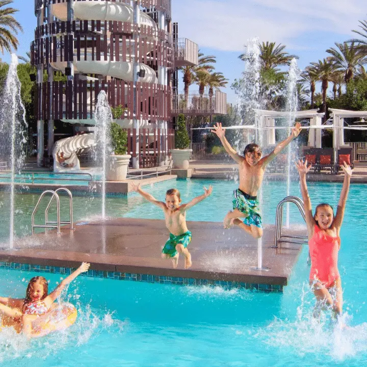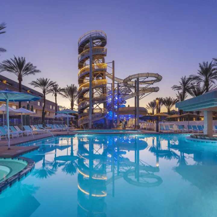 Another less traditional hotel + waterpark combo, the Arizona Biltmore combines glamour, playfulness, and design. This hotel offers seven sparkling pools, including a Paradise Pool with a 65-foot triple “The Twist” water slide and a children’s splash pad. Additionally, the resort offers daily family yoga, lawn games, and live music.