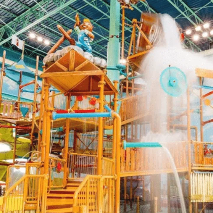 The park features water slides for all ages, a lazy river, splash playgrounds, and more. Indoor adventures include bowling, climbing, a 3D adventure, arcade, VR, and lasertag.