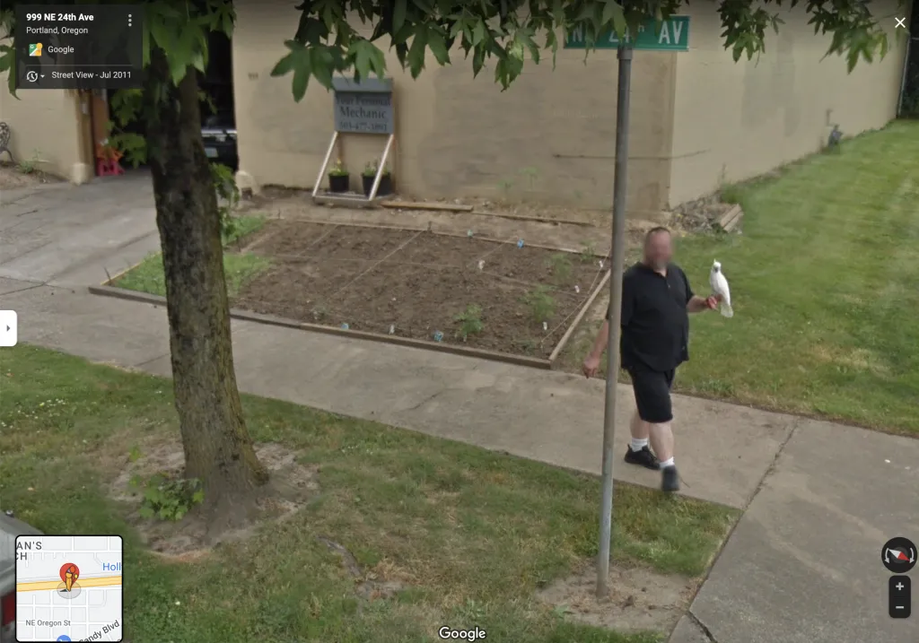 A man in Portland, Oregon, takes a stroll with his cockatoo perched on his hand. Click here to see it on Google street view.