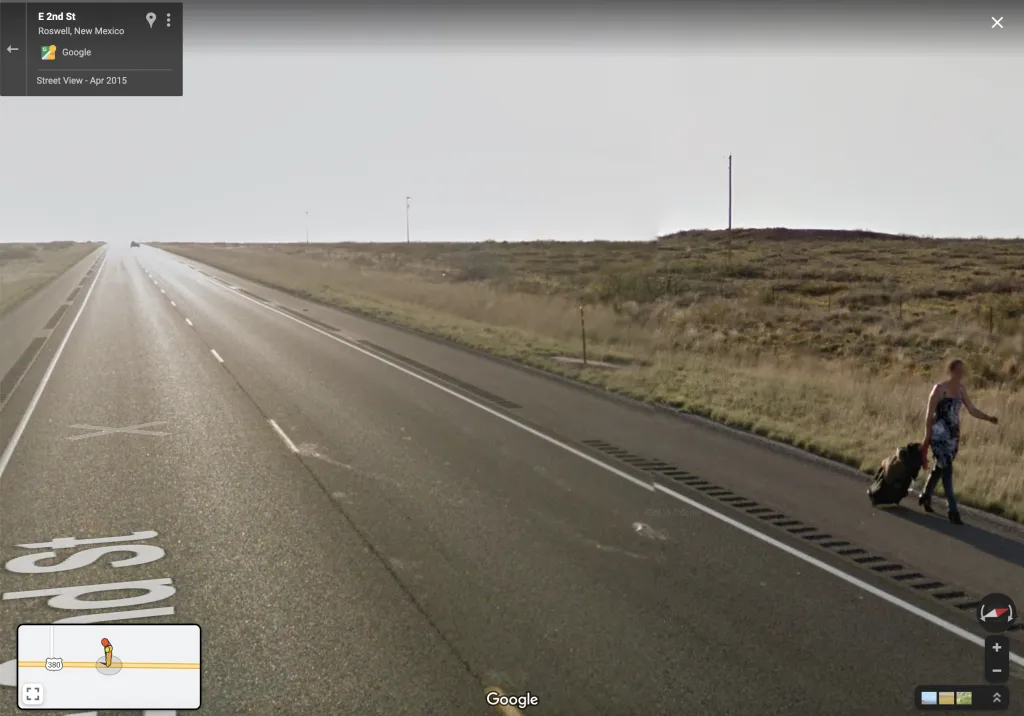 A woman walking in the middle of nowhere in New Mexico was caught by the Google street view car. Click here to see it on Google street view.