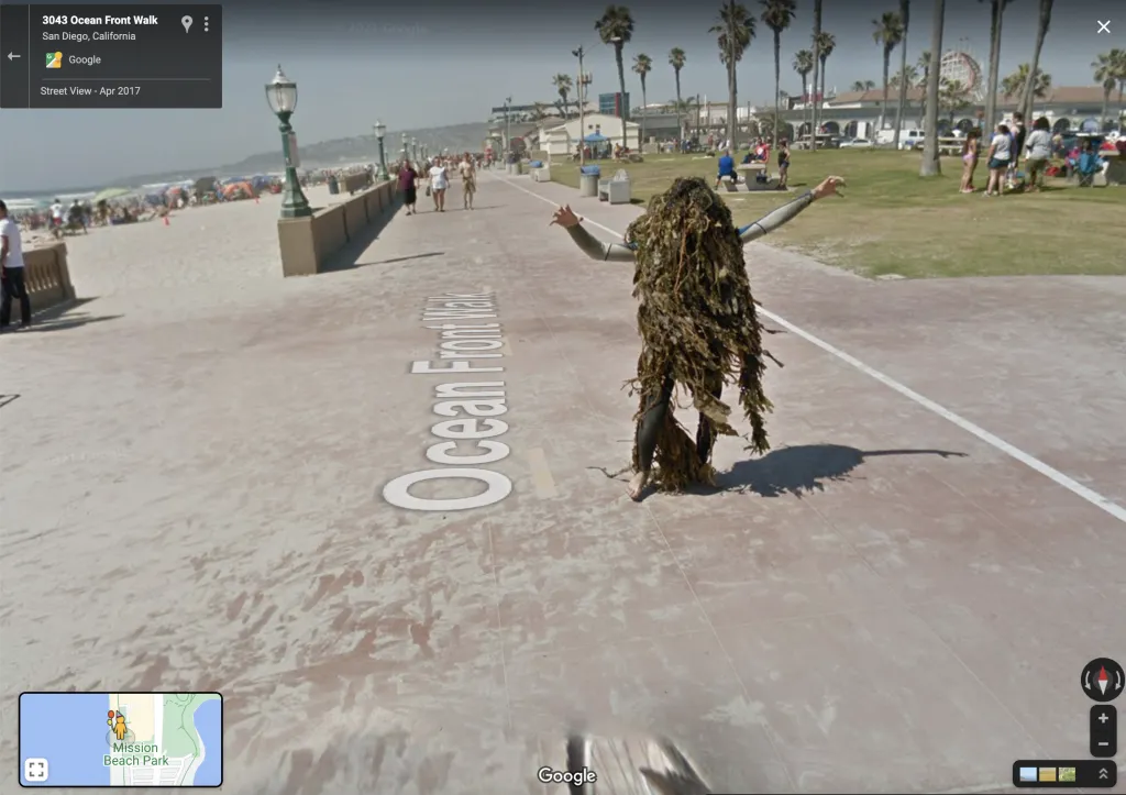 Near Mission Beach, California, you will find a person that looks to be covered in seaweed. Click here to see it on Google street view.