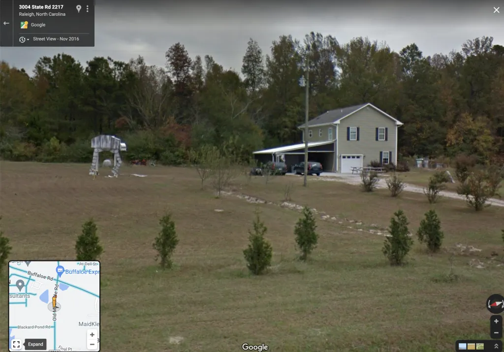This lawn in Raleigh, North Carolina, is home to an AT-AT Walker lawn decoration. Click here to see it on Google street view.