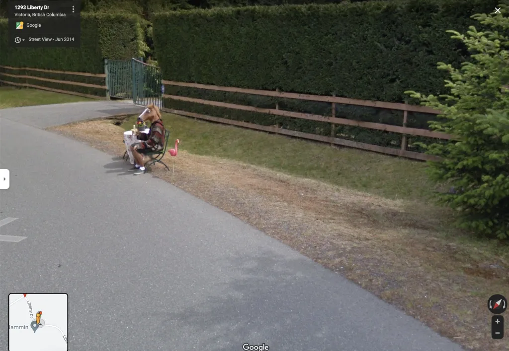 A person is sitting in a horse mask and cozy robe while enjoying a banana. We think this meets the criteria for funny Google street views.