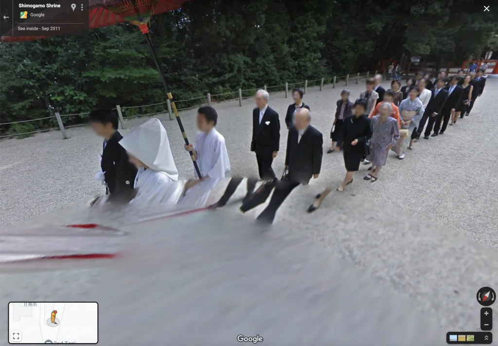 In September 2011, you can see a wedding march in Kyoto via Google Maps street view. Click here to see it on Google street view.