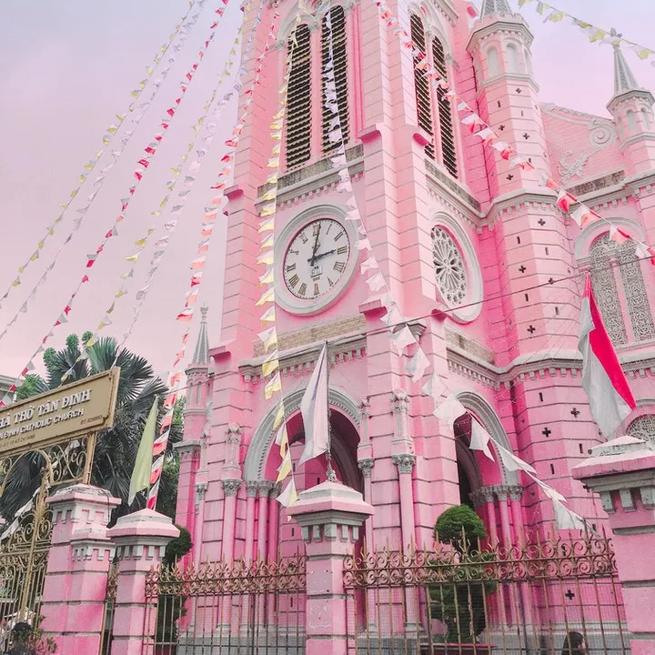 Places of Pink: Tan Dinh Church, Ho Chi Minh City(Vietnam), Tangsi Beach(Indonesia), Hawa Mahal(India), Cherry blossoms(Japan), Lake Hillier(Australia)