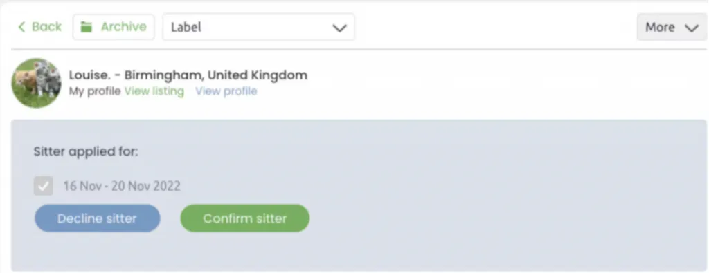 - Communicate clearly: Respond to sitters’ applications as soon as possible, as it’s likely that they have also replied to several opportunities. Describe any responsibilities as precisely as possible, e.g. suggesting the times for the walks, or the amount of food to be given.