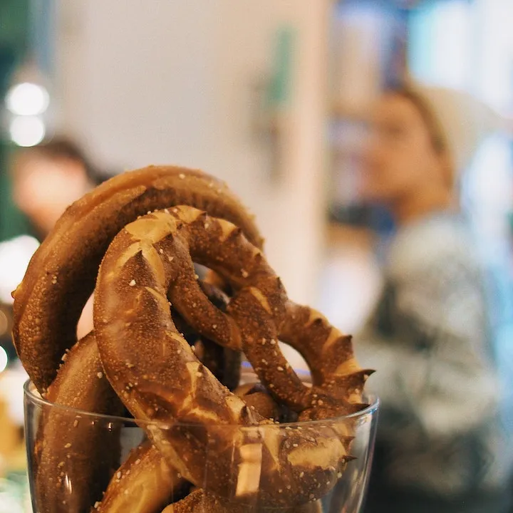 Pretzels and beer, please! Pretzels, or Brezeln, are a German classic and probably one of the most common foods associated with Germany. Think Oktoberfest! And pretzels and beer! These tasty snacks (or meals) were introduced to America centuries ago. Enjoy with spicy mustard, cheese, or cinnamon and sugar.