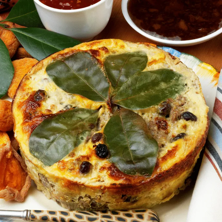 • Bobotie consists of spiced mince, an egg-based topping, and traditionally raisins or sultanas. This is a sweet dish that can include curry, almonds, and turmeric.