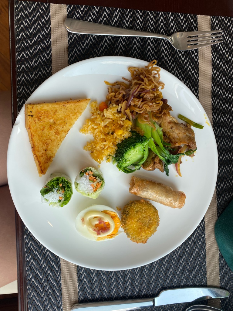 התעוררנו במטוס, אכלנו ארוחת בוקר שכללה חביתה, נקניקיות, תפוחי אדמה, לחם וחמאה, הארוחה הייתה נחמדה ממש. צפינו בזריחה מהמטוס, היא הייתה בצבעי ורוד רגע מאוד מיוחד, נחתנו בבנגקוק שבתאילנד, אמא שלי הלכה לעשות מסאז׳ ואני נרדמתי על ספה באמצע השדה תעופה.
