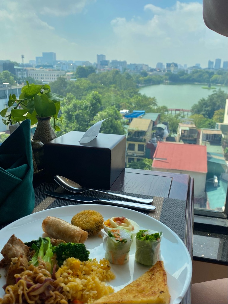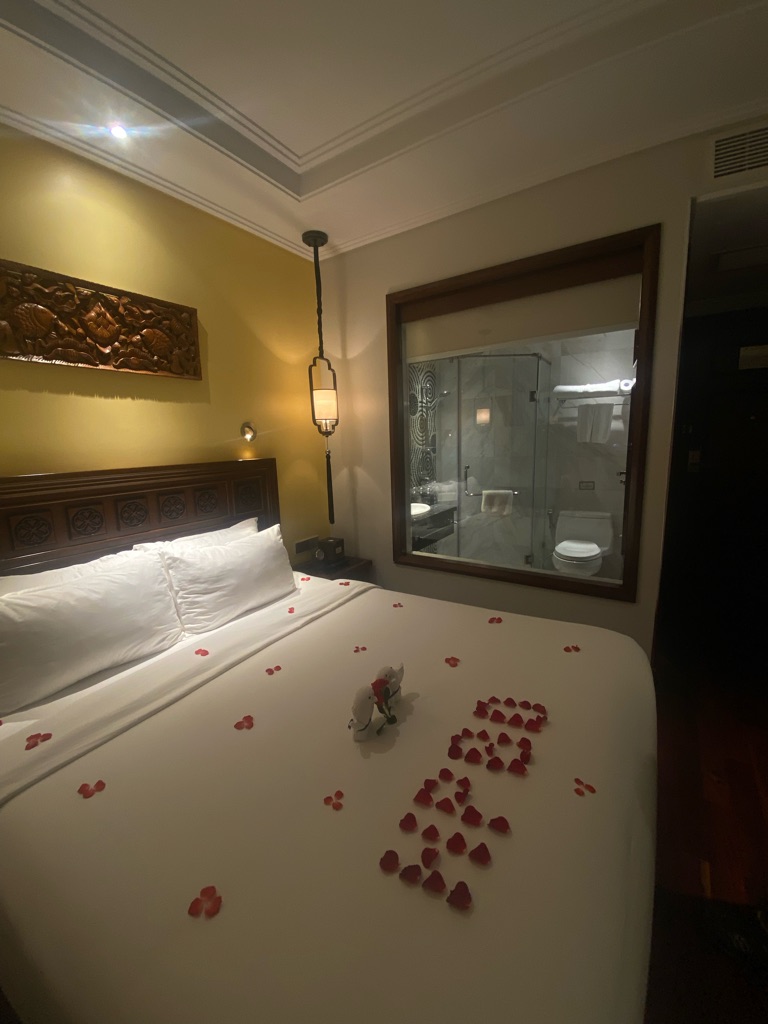 בשדה תעופה אכלנו בגט עם בשר, הארוחה הראשונה שלנו בויאטנם! ולאחר מכן לקחנו מונית למלון שנמצא במרכז האנוי שמשקיף לאגם יפה, כשהגענו למלון בירכו אותנו עם תה וקרקרים, מאוד נחמד וטעים. החדר מאוד חמוד ויפה וכמו שציינתי עם נוף מהמם לאגם ולשווקים שבעיר, כמו ישראליות מצויות אמרנו שיש לנו יום הולדת ואירגנו לנו מיטה עם ורדים מפוזרים עם הכיתוב "HPBD" עם עיצוב מגבות מאוד חמוד.