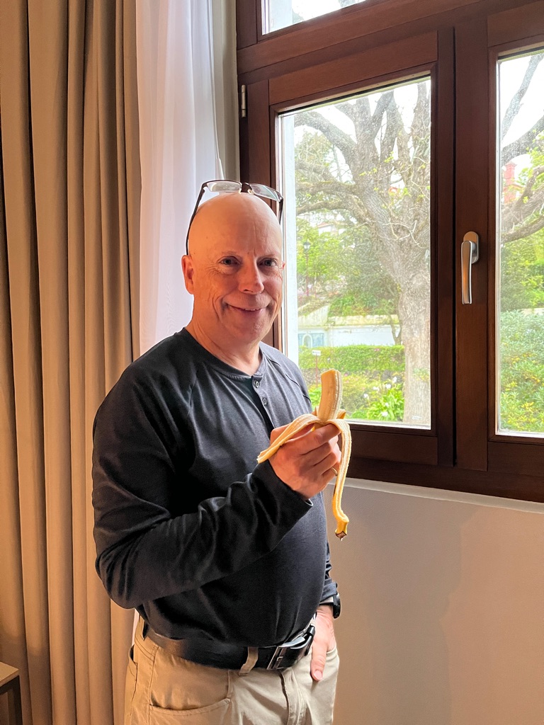 Back in our room for final departure preparations. Enjoying one of the local bananas we had grabbed with breakfast. They almost have the taste of a banana popsicle. More creamy and sweet than ours are.