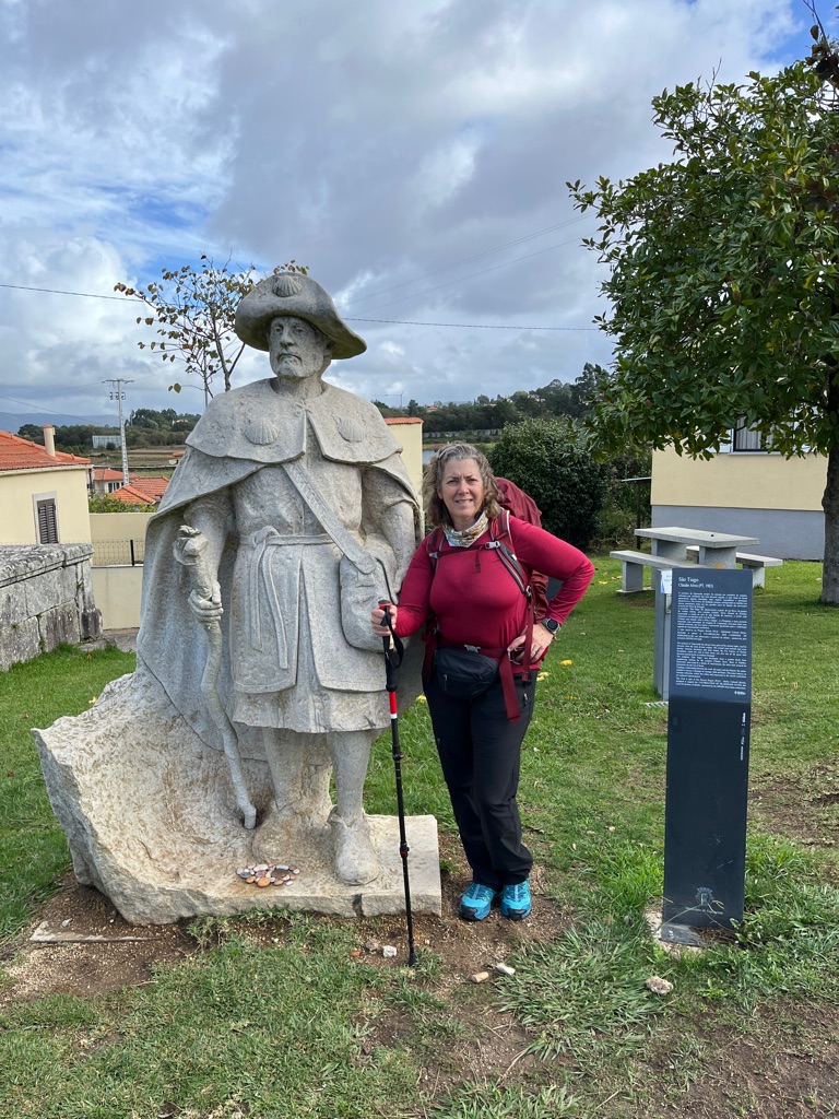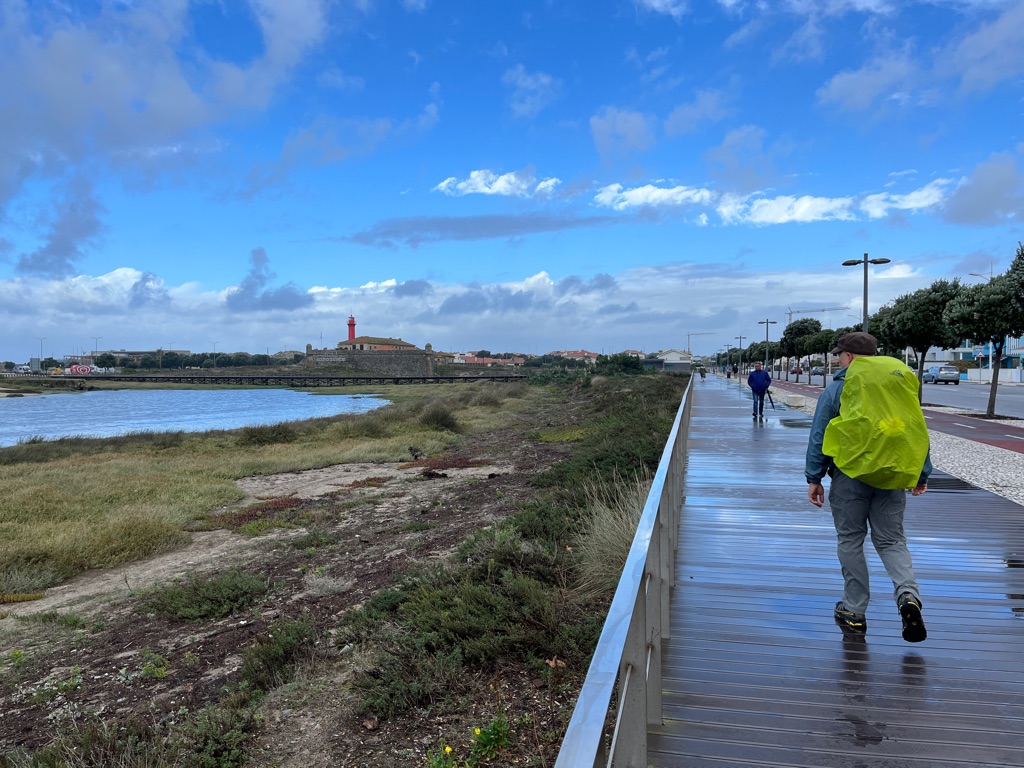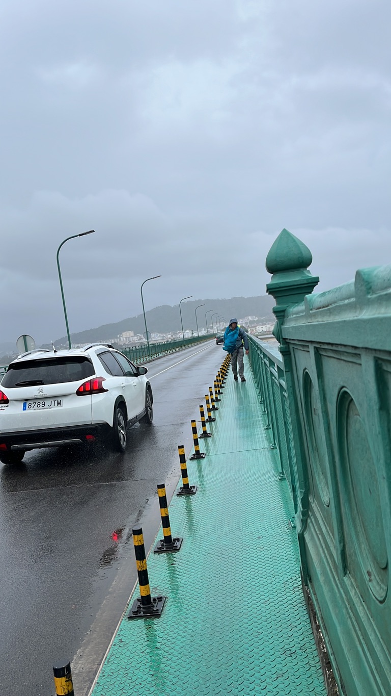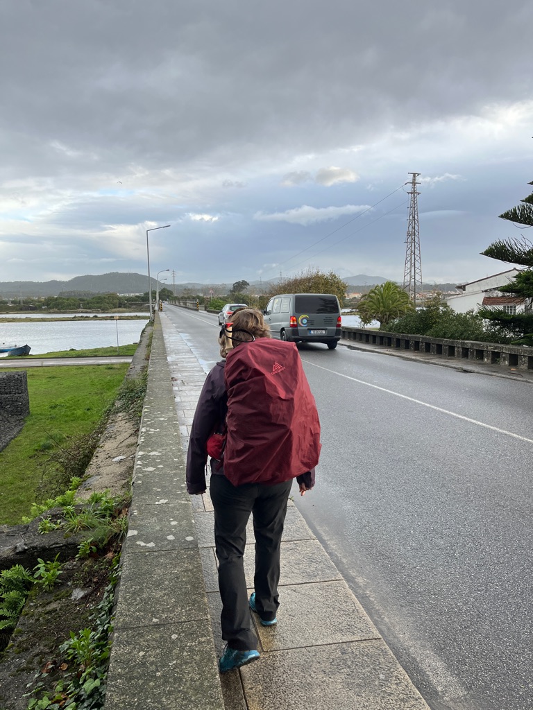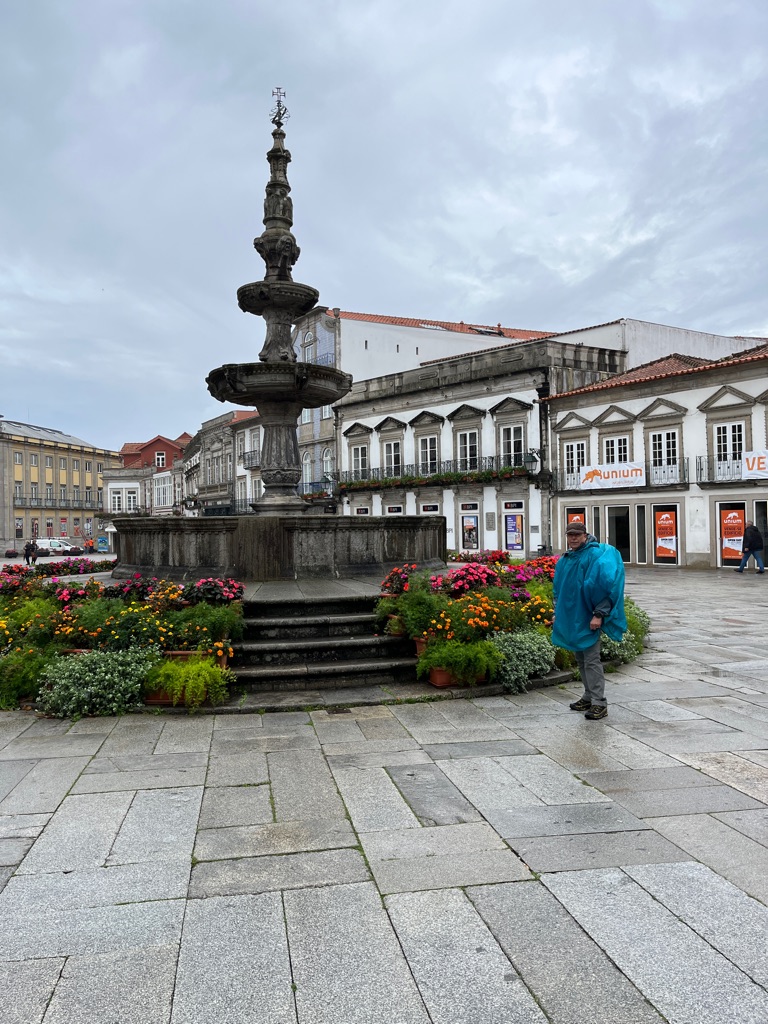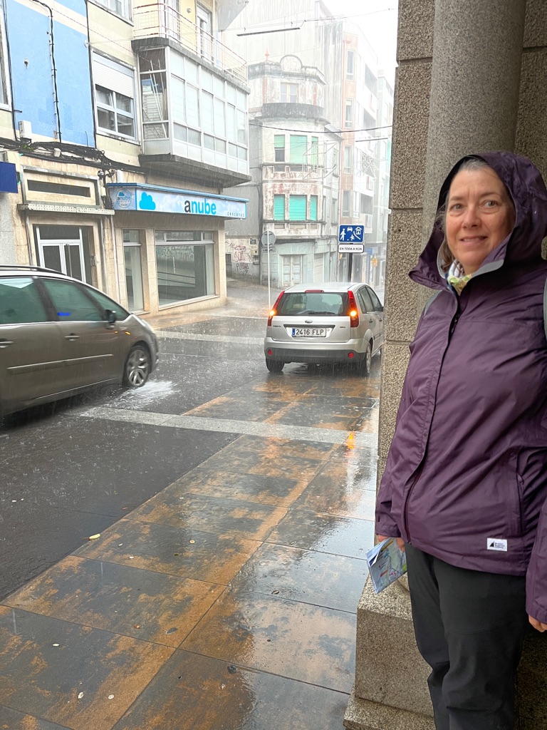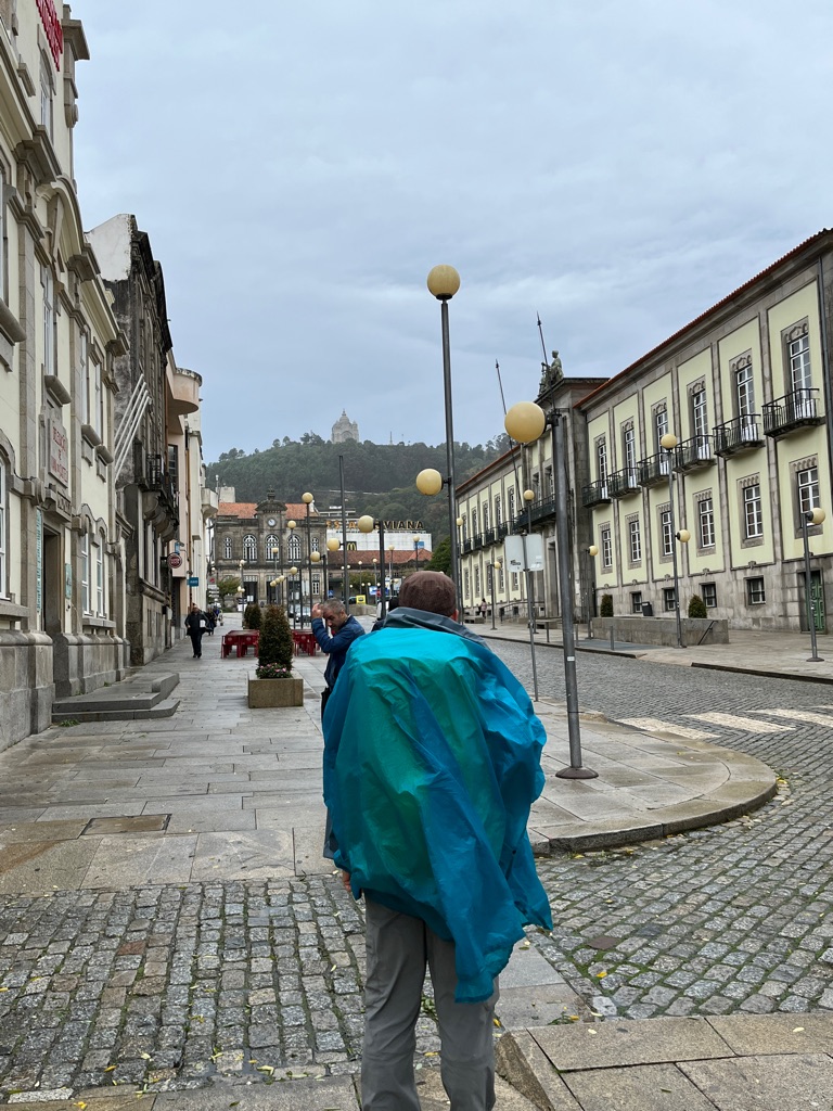 At about 10 am we entered the large city of Viana do Castelo. There was a very very long bridge as you enter the city. Normally this would have been a great vantage point to take photos, however today we were in a downpour at the time we were crossing, the wind kept wiping our ponchos and us. I was holding onto the bridge with one hand and my poncho with the other so I could see where I was going. Our first coffee stop was just across the bridge and we lingered here quite a while until the rain seemed to subside a bit.