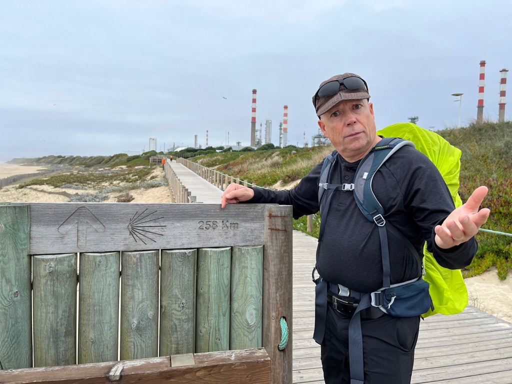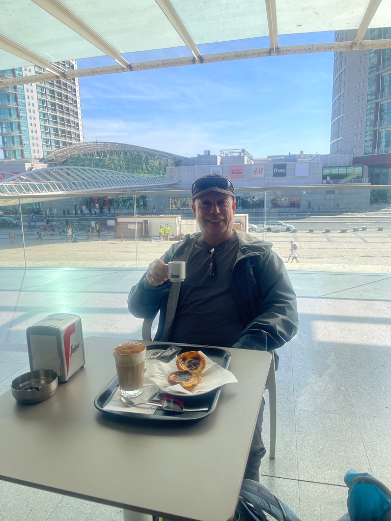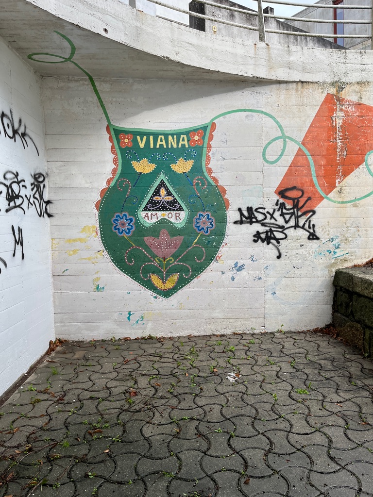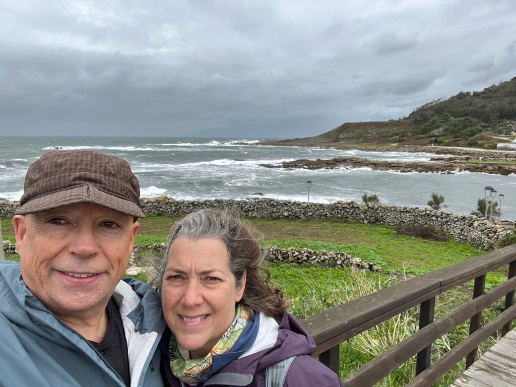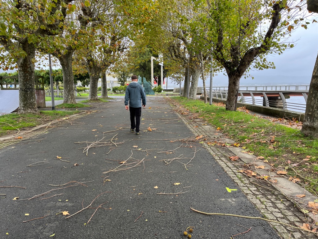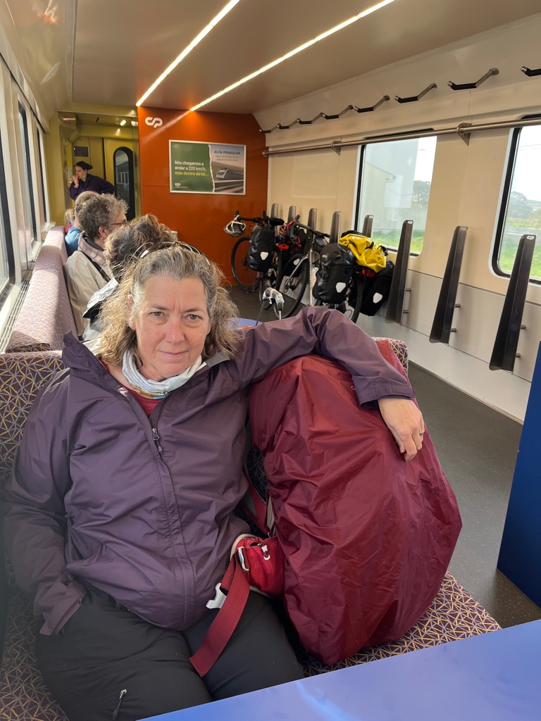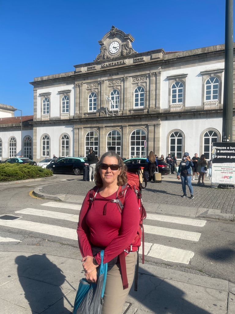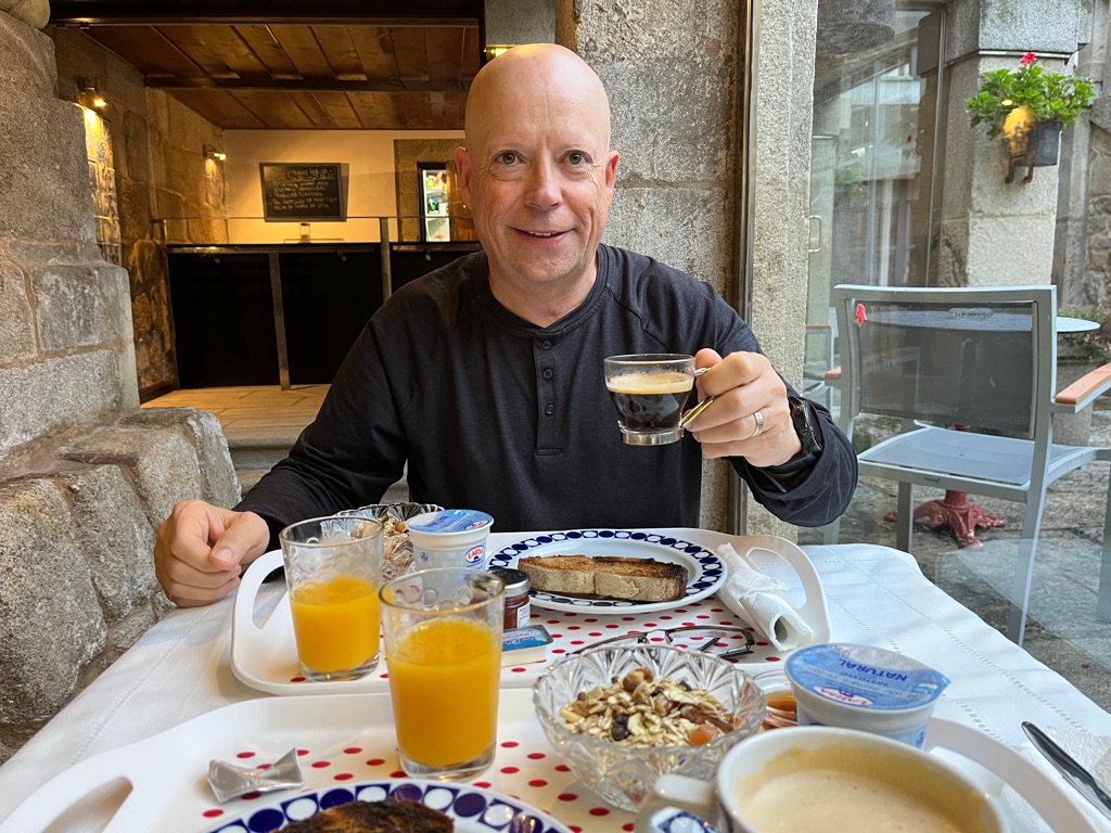 At about 10 am we entered the large city of Viana do Castelo. There was a very very long bridge as you enter the city. Normally this would have been a great vantage point to take photos, however today we were in a downpour at the time we were crossing, the wind kept wiping our ponchos and us. I was holding onto the bridge with one hand and my poncho with the other so I could see where I was going. Our first coffee stop was just across the bridge and we lingered here quite a while until the rain seemed to subside a bit.