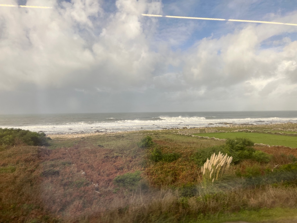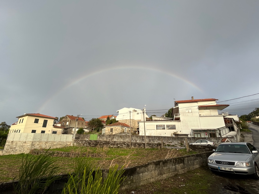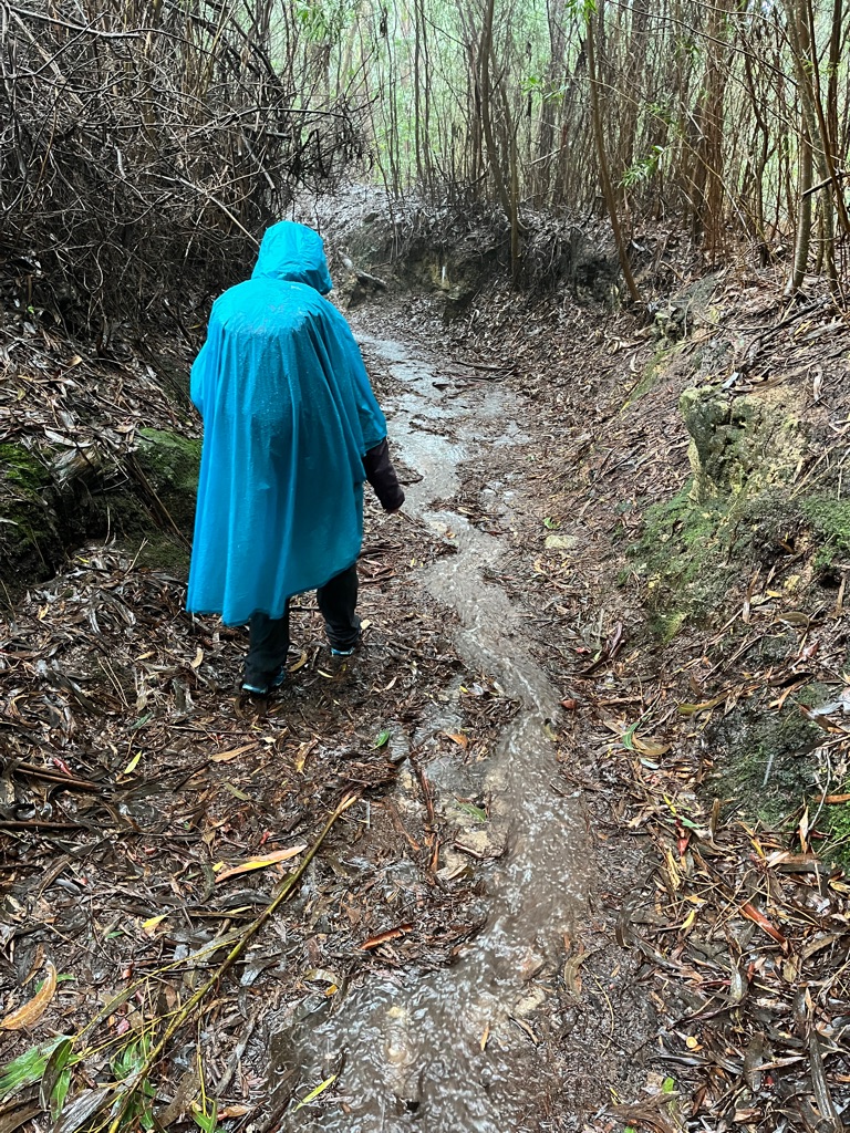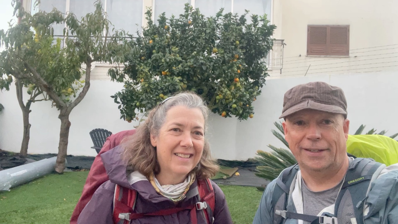 At 8:42am, we saw the rainbow which was beautiful, but a sign of also what was ahead. By 9 am we had our first downpour. It was off and on all day. Thankfully many homes had large overhangs on their doors so when it got too intense we tucked in as best we could out of the rain.