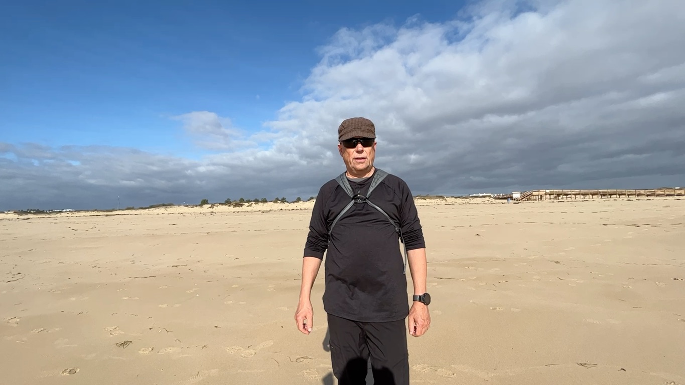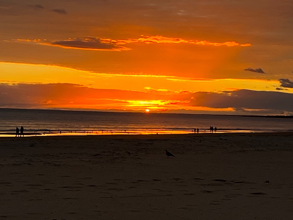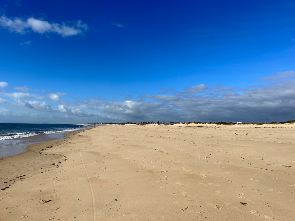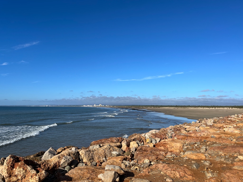 Looking out at the sea over the white rocks along the shore. If we were home we would be looking out at the lake over the white snow on the lawn.