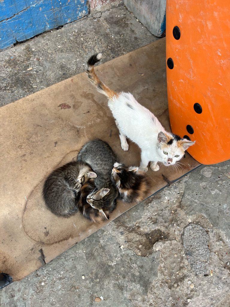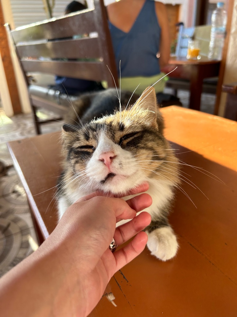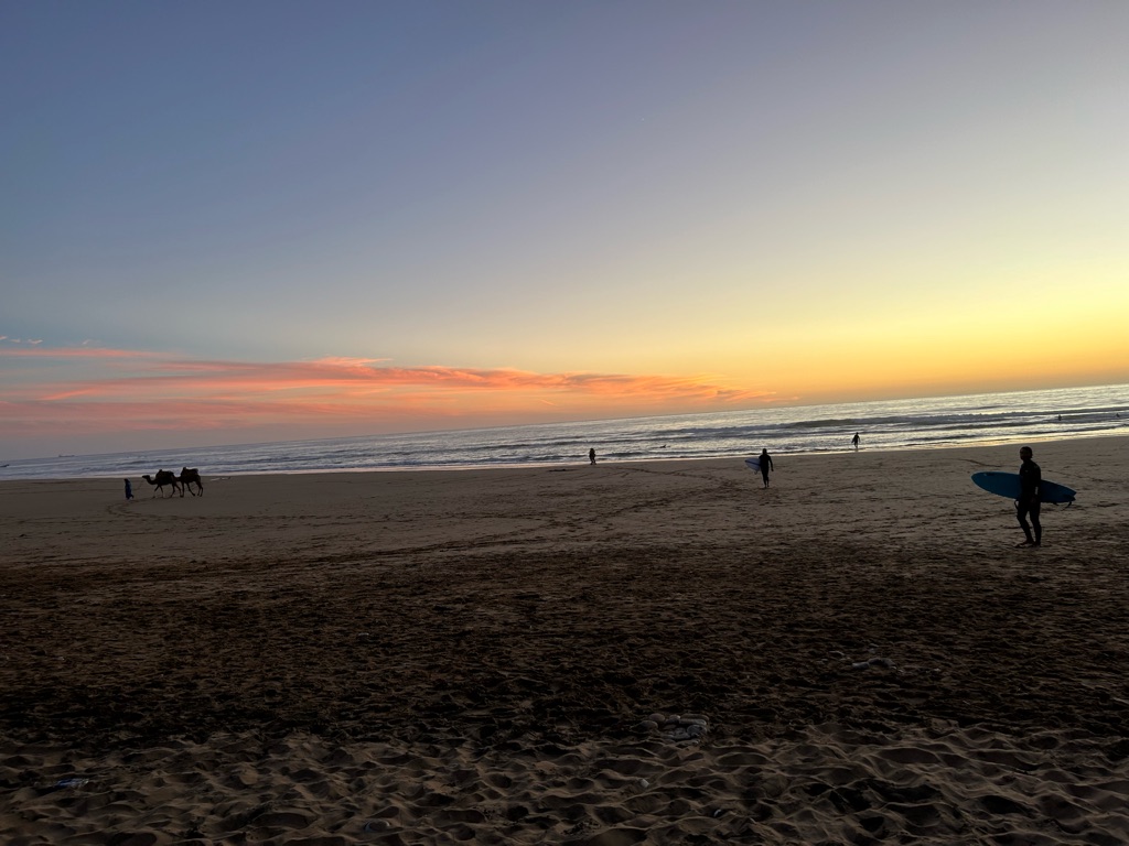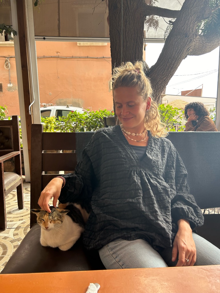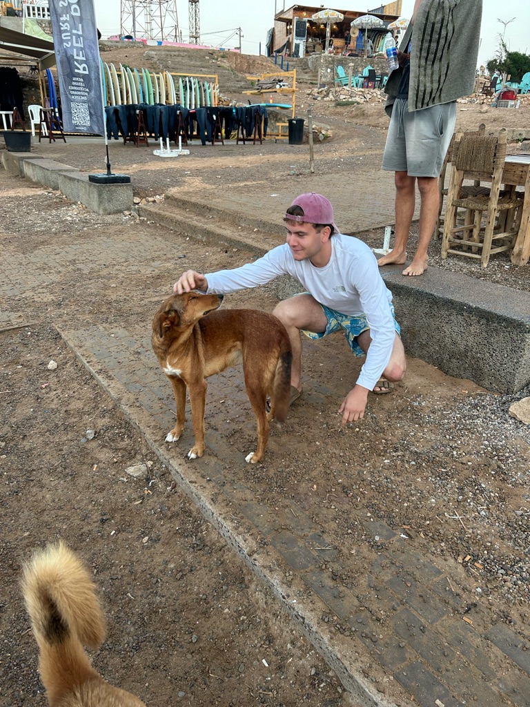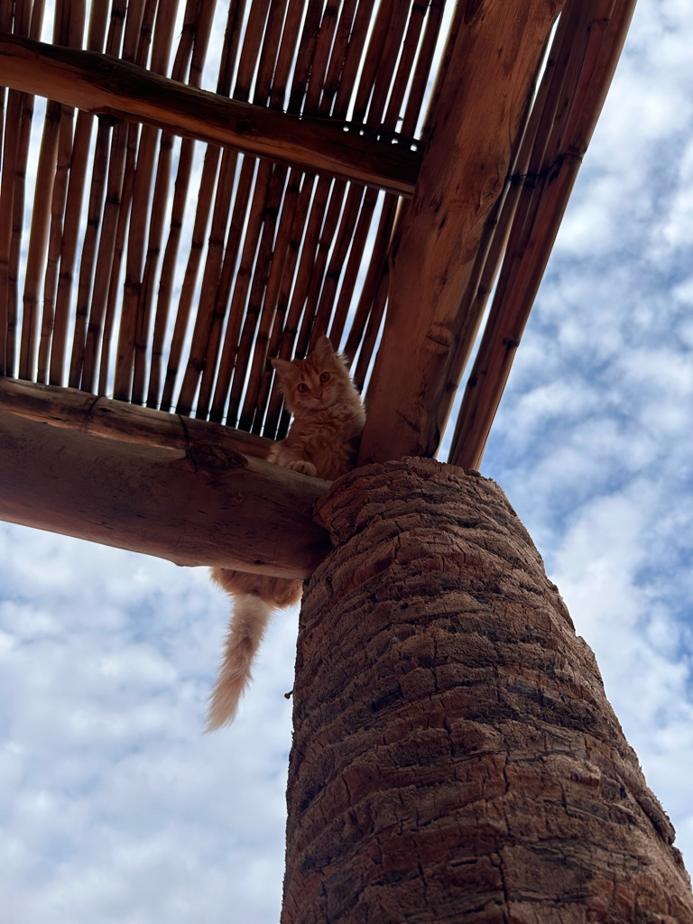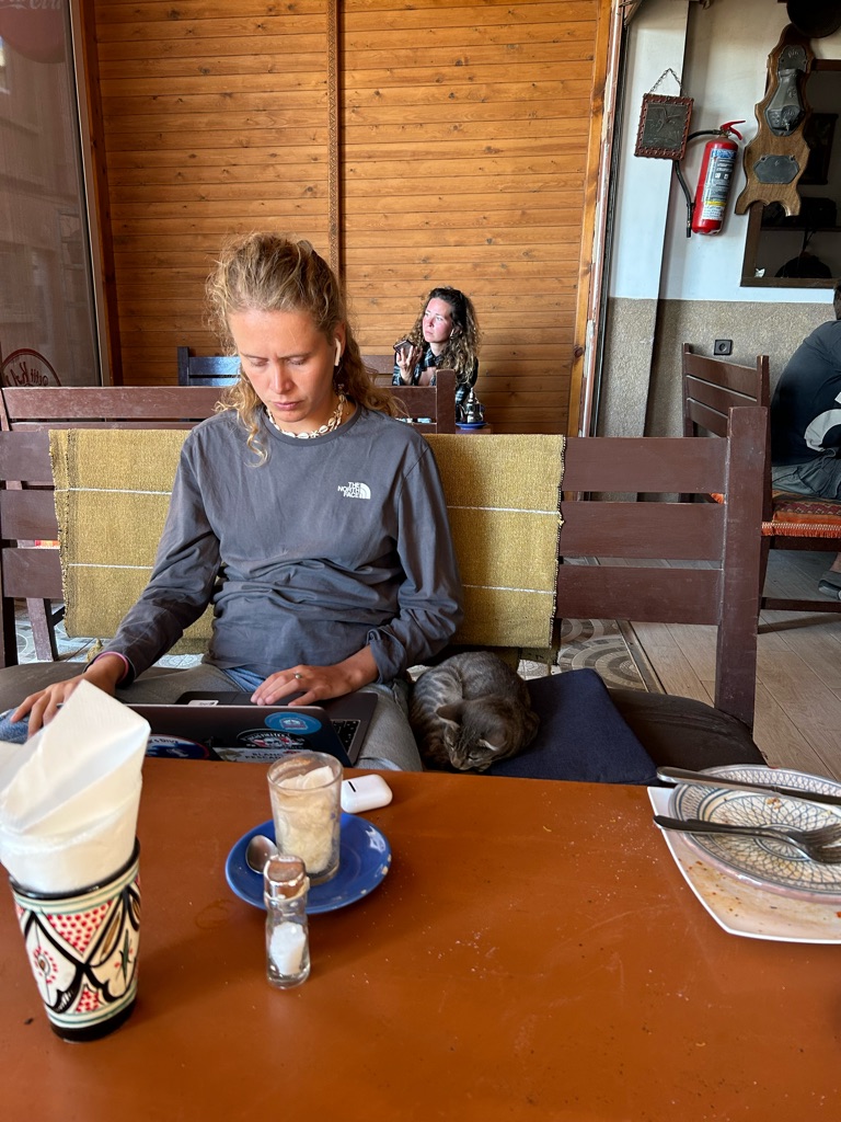 Het viel hier meteen al op dat er echt overal katjes zitten, ook in het café liepen ze overal. Na de lunch besloot ik een rondje door het dorpje te lopen, dat vrij klein lijkt op basis van wat ik gezien heb, en daarna het dichtstbijzijnde stuk strand te bekijken. Dit is gelukkig dichtbij, op zo’n 15 minuten lopen van het hostel, en ik heb hier de eerste surfers én kamelen gespot.