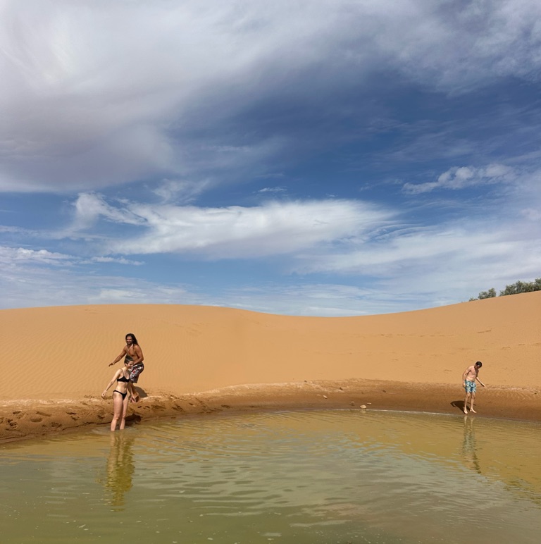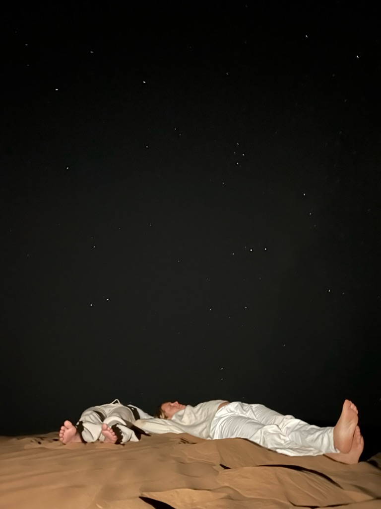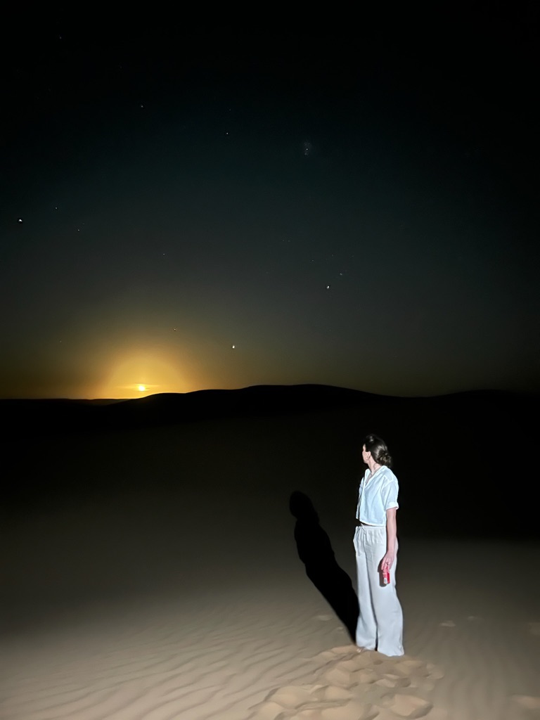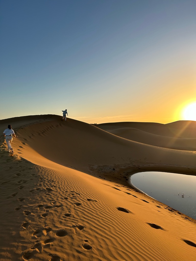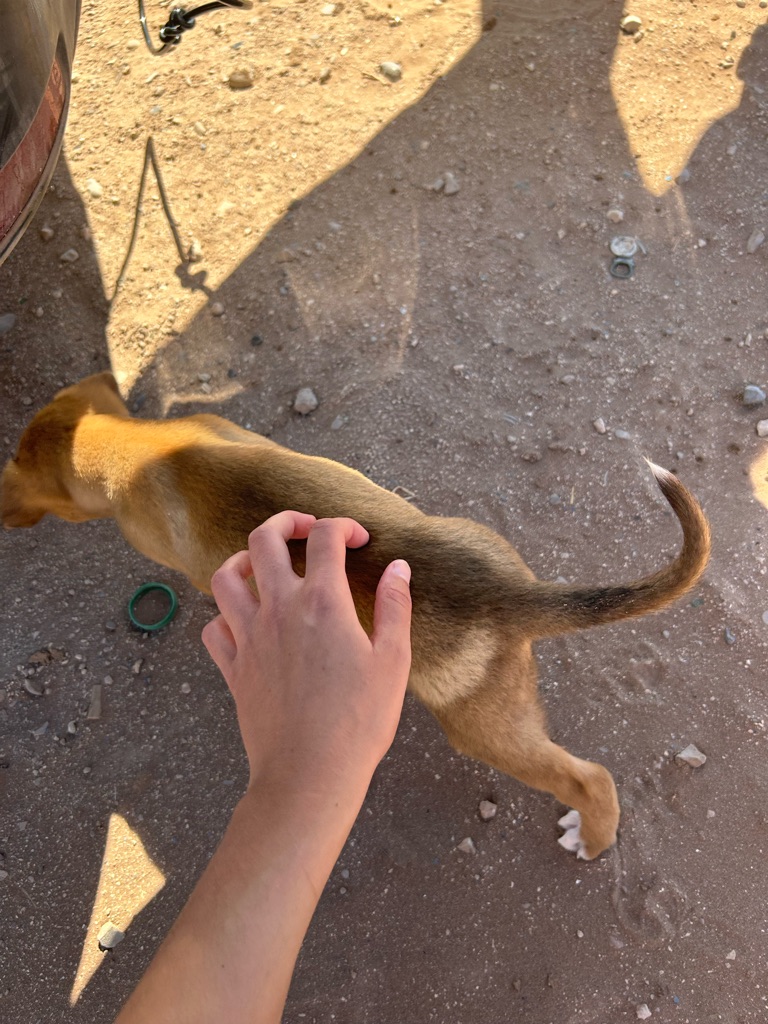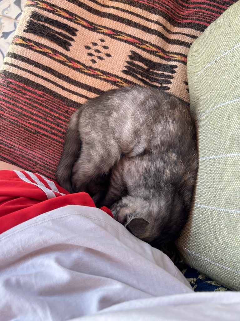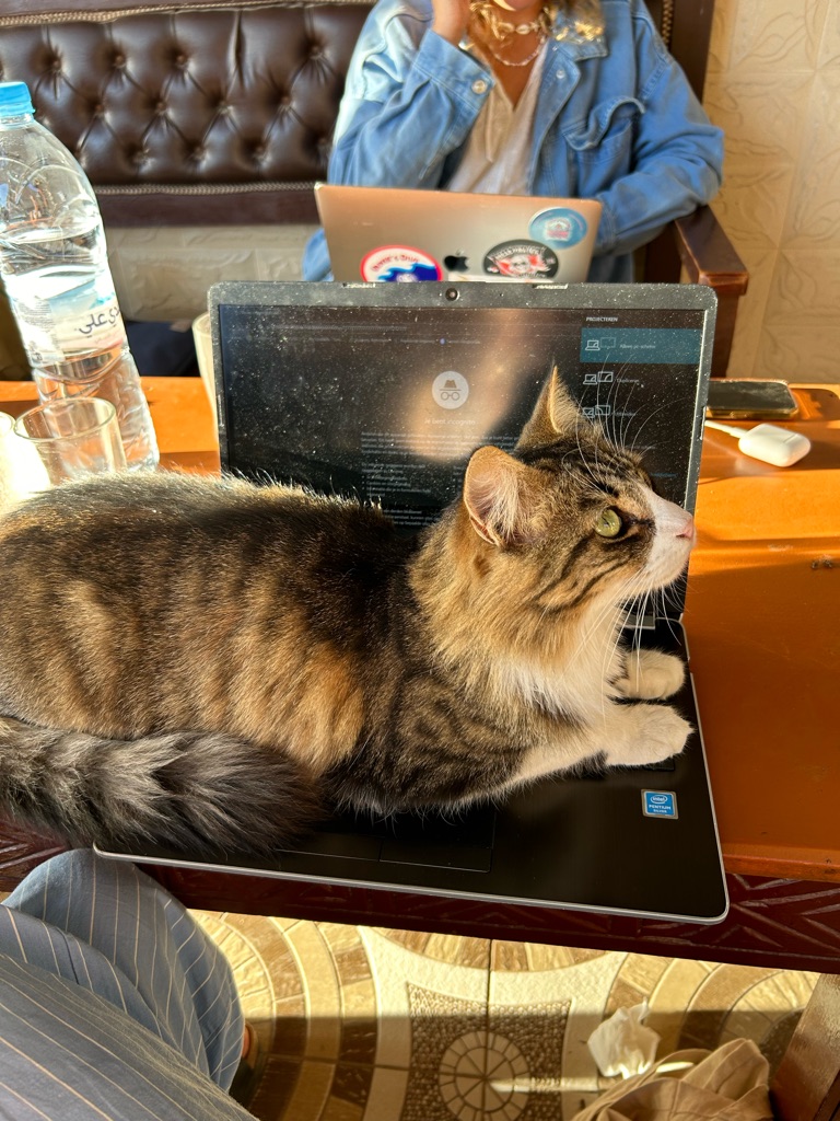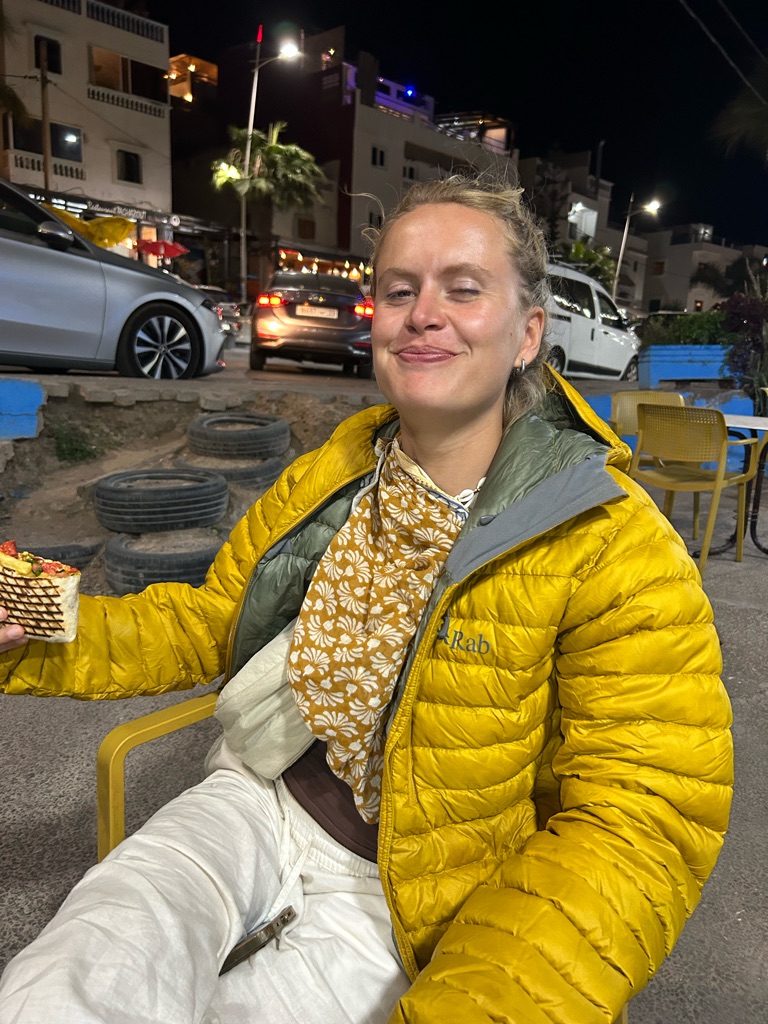 Het viel hier meteen al op dat er echt overal katjes zitten, ook in het café liepen ze overal. Na de lunch besloot ik een rondje door het dorpje te lopen, dat vrij klein lijkt op basis van wat ik gezien heb, en daarna het dichtstbijzijnde stuk strand te bekijken. Dit is gelukkig dichtbij, op zo’n 15 minuten lopen van het hostel, en ik heb hier de eerste surfers én kamelen gespot.