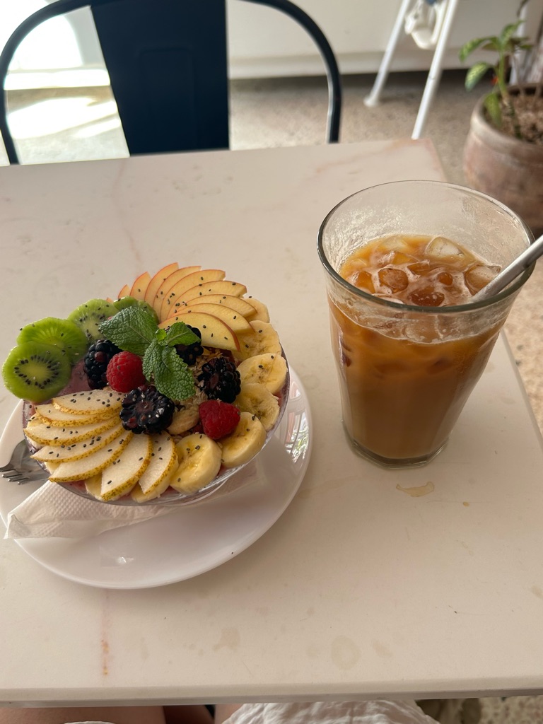 Nadat ik me had omgekleed besloot ik wat te gaan eten en ik belandde in het eerste de beste cafeetje in de straat. Hier heb ik lekker een ijskoffie, smoothie en panini genuttigd terwijl ik heb zitten lezen.