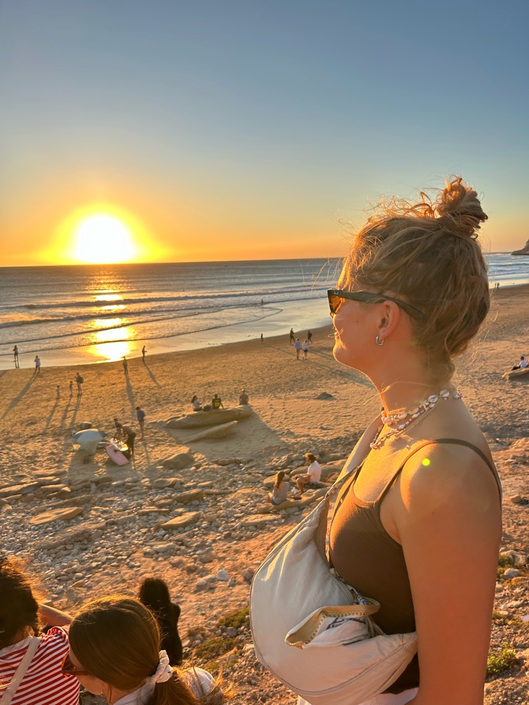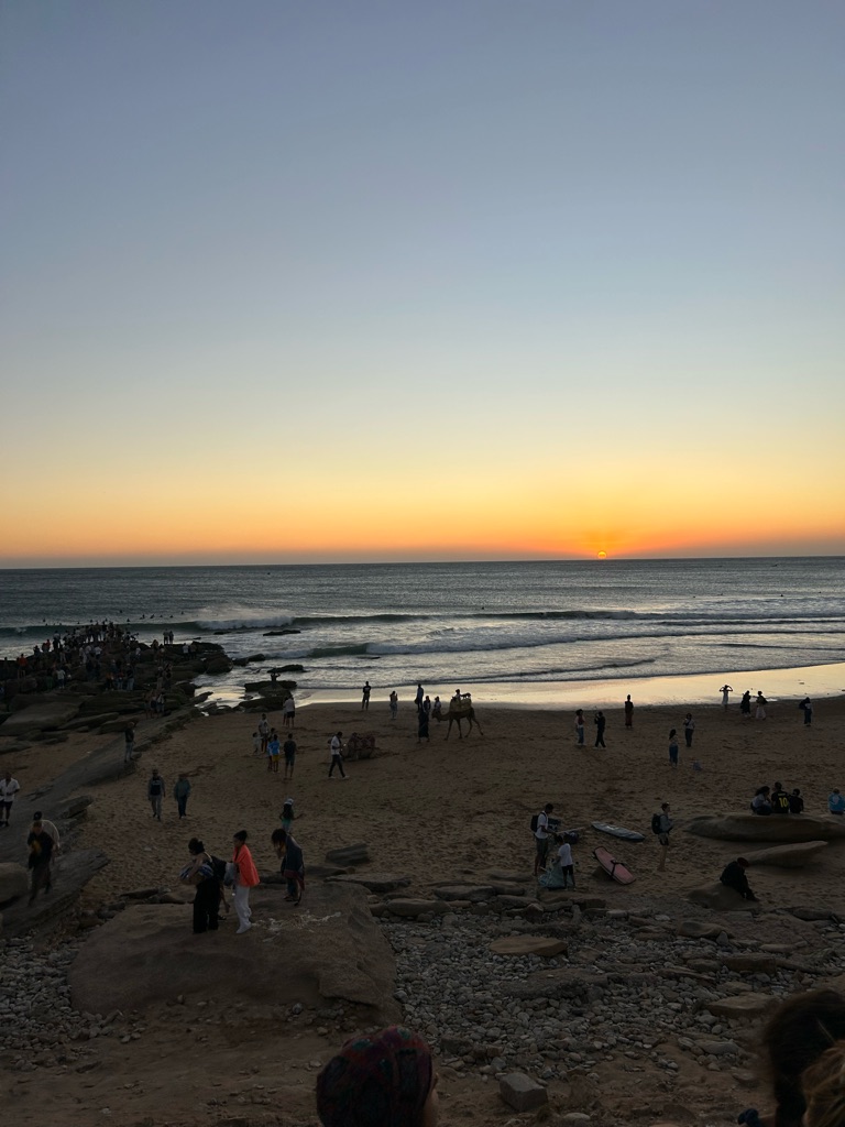 Na een verfrissende douche en een beetje lezen op het dakterras (met zonsondergang!) was eindelijk het avondeten aangebroken. Het was vandaag erg rustig met het avondeten, ik at samen met 2 Engelse meiden, Jade en Whitney. Mijn kamergenoot Imen (een Marokkaans meisje dat 2 nachten hier blijft) at toch niet mee dus we zaten maar met z’n drietjes. Desondanks waren het 2 leuke meiden en hebben we na het eten nog wat gekletst op het dakterras. Omdat ik toch wel moe begon te worden ben ik nu maar een beetje op tijd naar de kamer gegaan. Nog eventjes lekker chillen op bed en dan op tijd slapen. Want morgen staat een leuke dag op het programma met een yogales en surfles dus ik moet uiteraard fit zijn!
