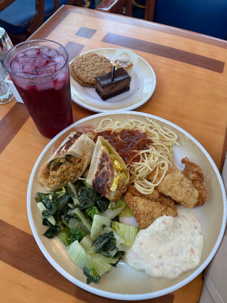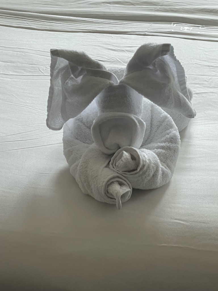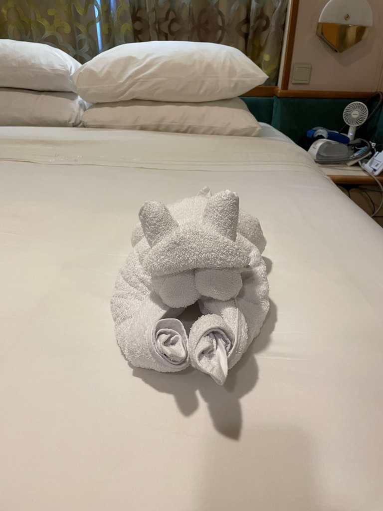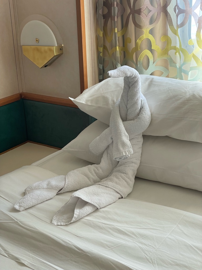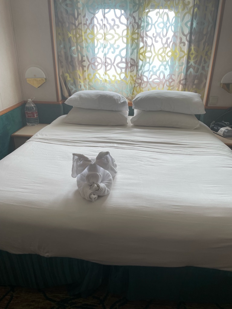 My cabin has an ocean view, but being on deck 2 at the bottom of the ship means the ocean view is close up - AND the ocean flies past your window when the ship is sailing. Look out your window for even a few seconds and get instant motion sickness 🤢 🌊 🌊 🤮 Keep the curtains closed!