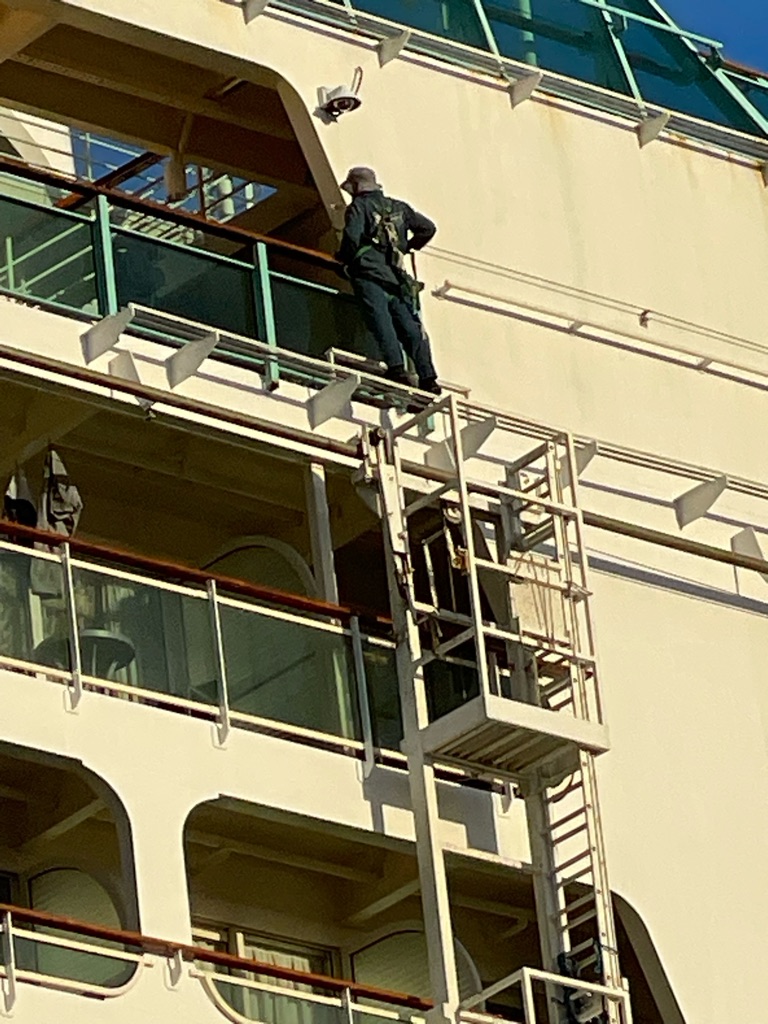 As you enter or leave major American shipping ports, cruise ships have an escort. Sometimes it’s a local police force other times it’s the Coast Guard. \240The escort clears the way of smaller ships and boats. The guy at the front of the boat with the giant gun ensures prompt compliance.