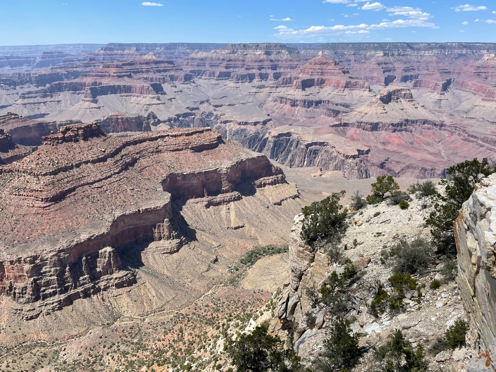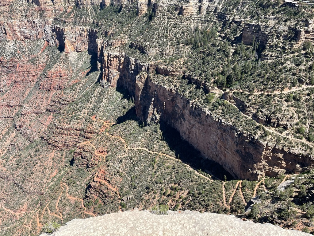 When we got back up to the rim, we caught a bus that took us to ten viewpoints along the rim heading west from the Bright Angel trailhead. At the first stop we were able to see the trail we had just done with all the switchbacks and could even see the rest house we stopped at.
