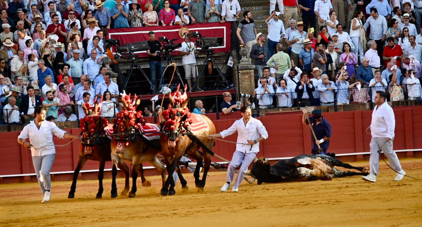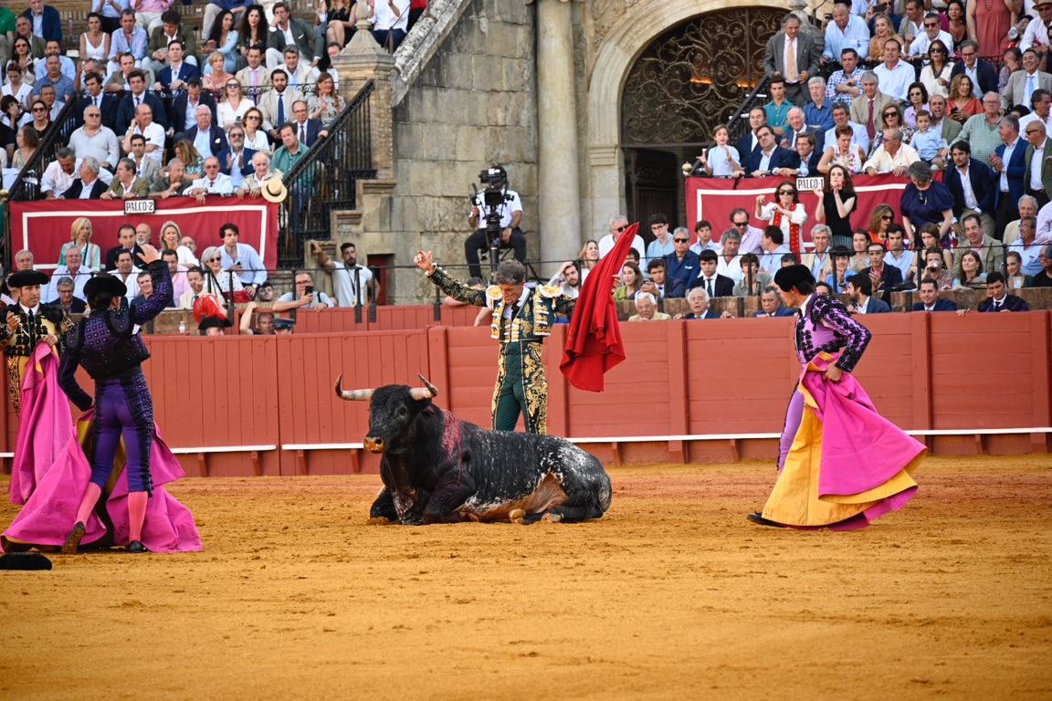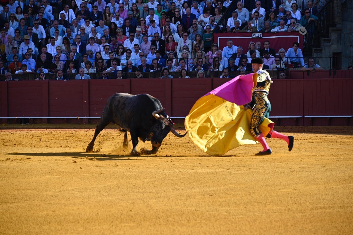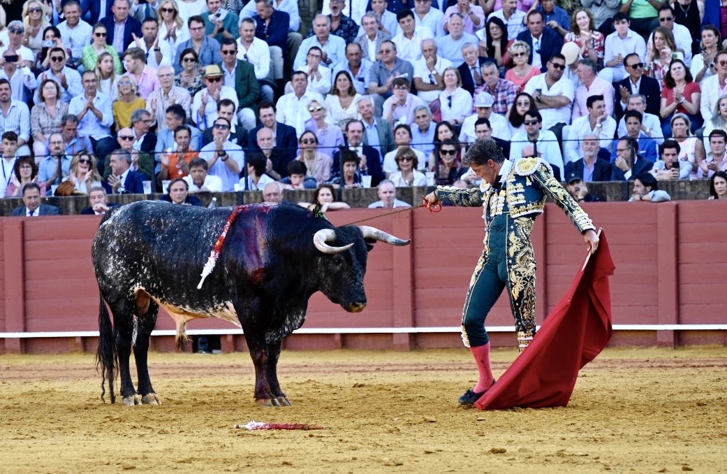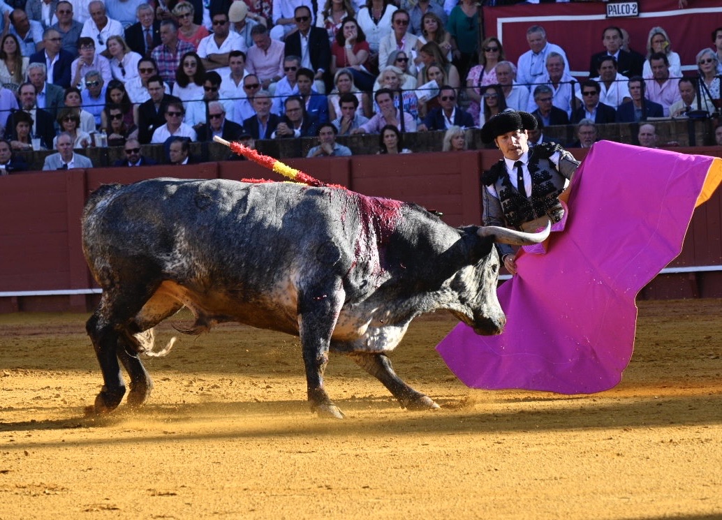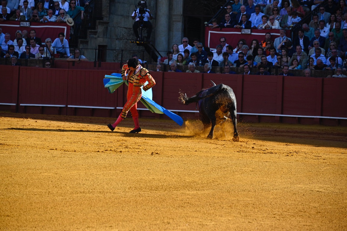 By this point the bull has lost a significant amount of blood, exhausting the animal. The matador then enters with his cape and sword, attempting to tire the bull further with several runs at the cape.
