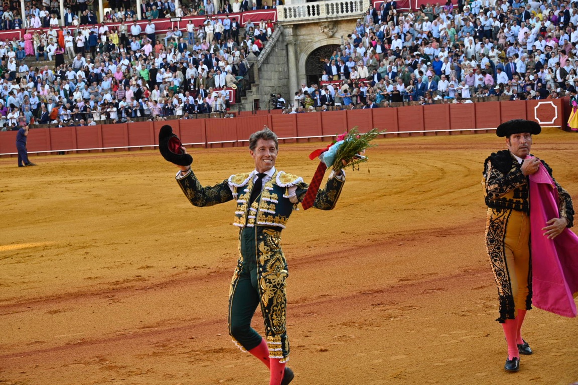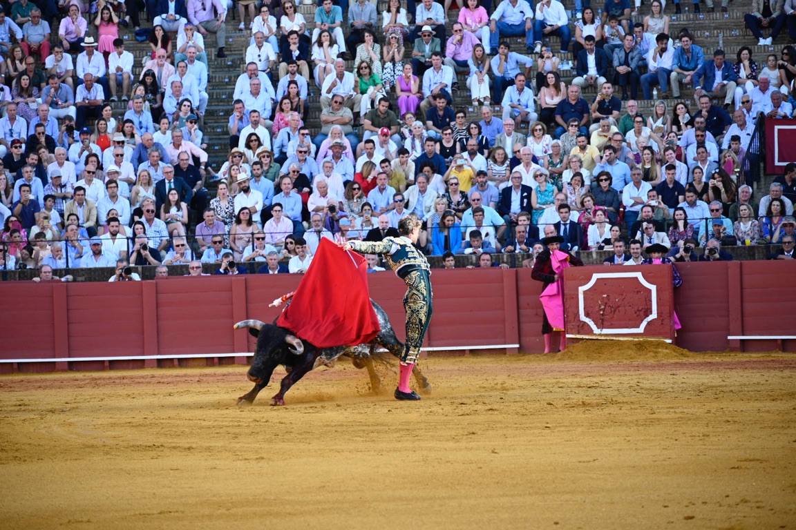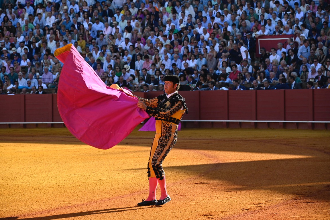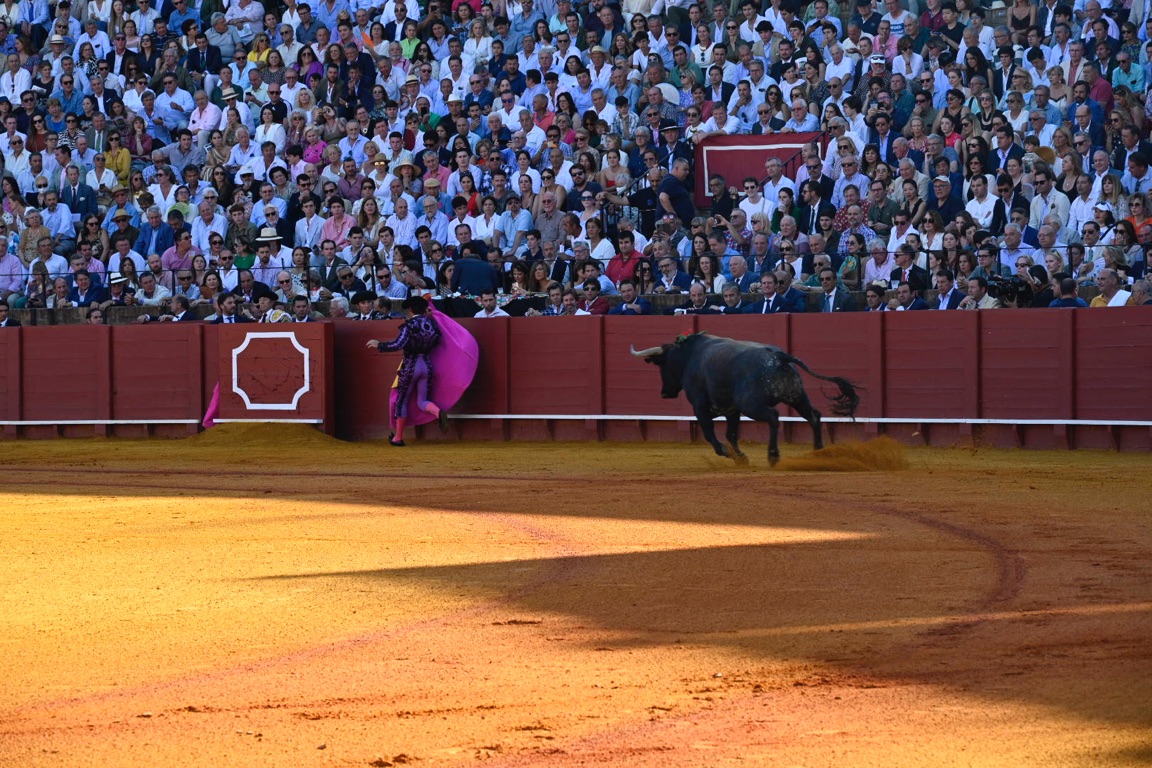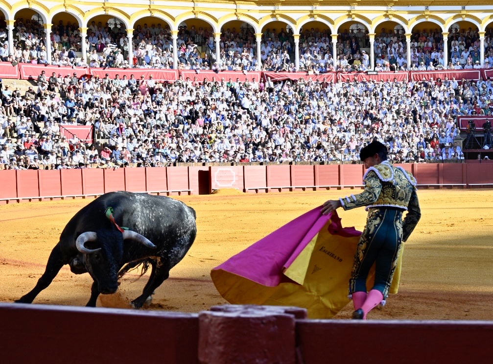 By this point the bull has lost a significant amount of blood, exhausting the animal. The matador then enters with his cape and sword, attempting to tire the bull further with several runs at the cape.