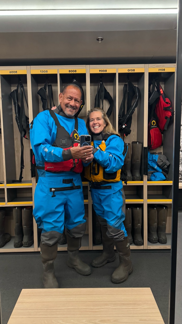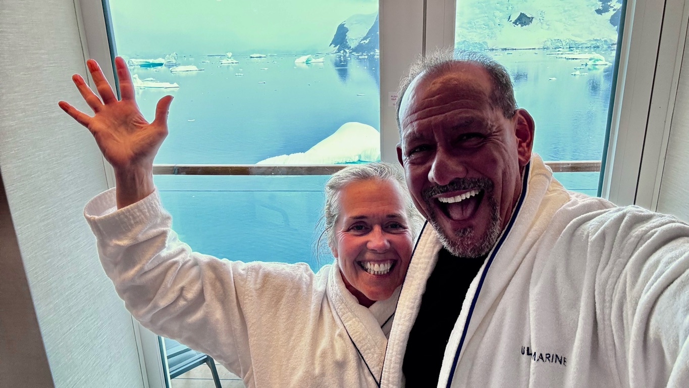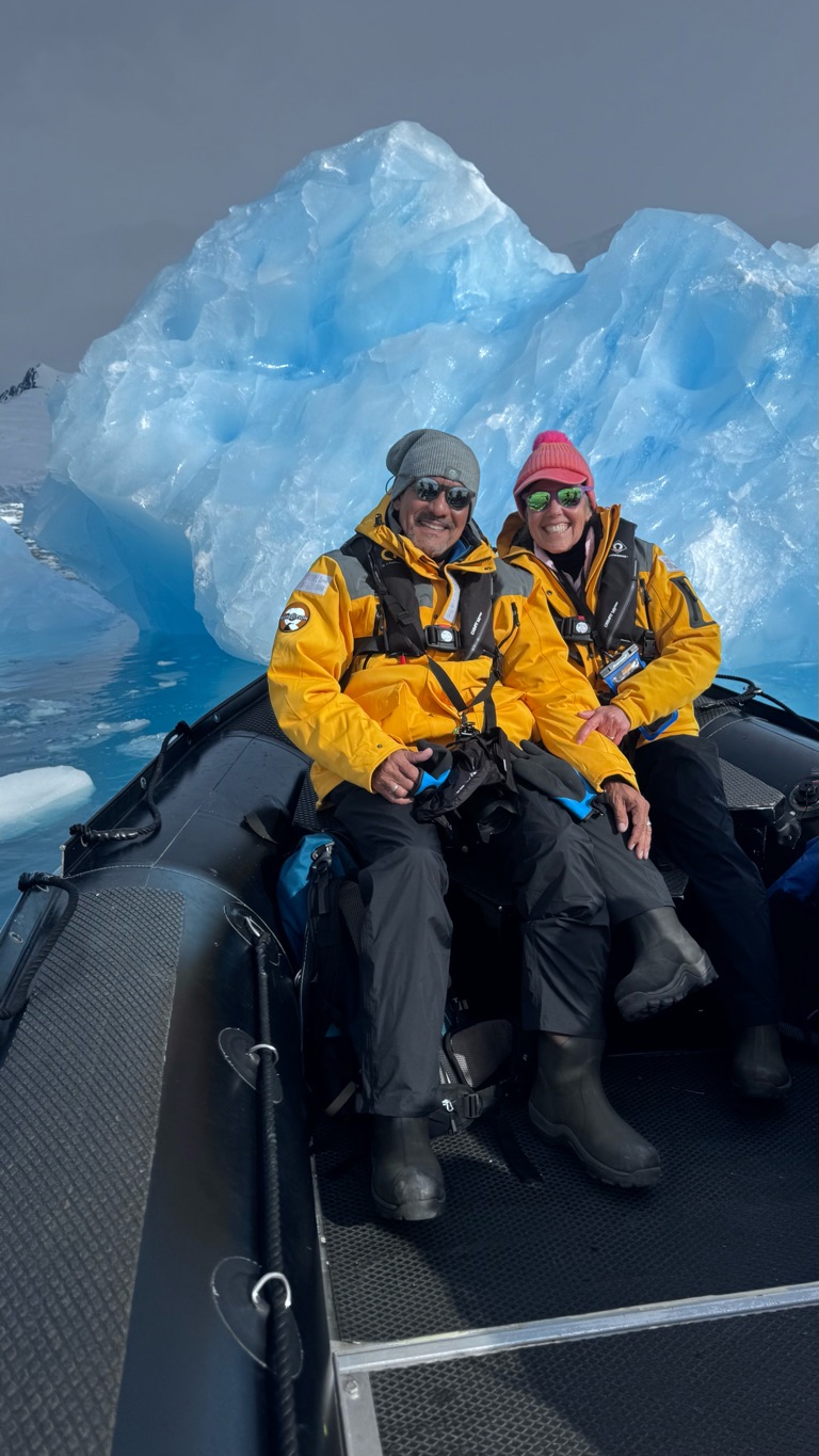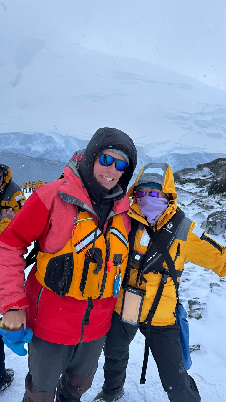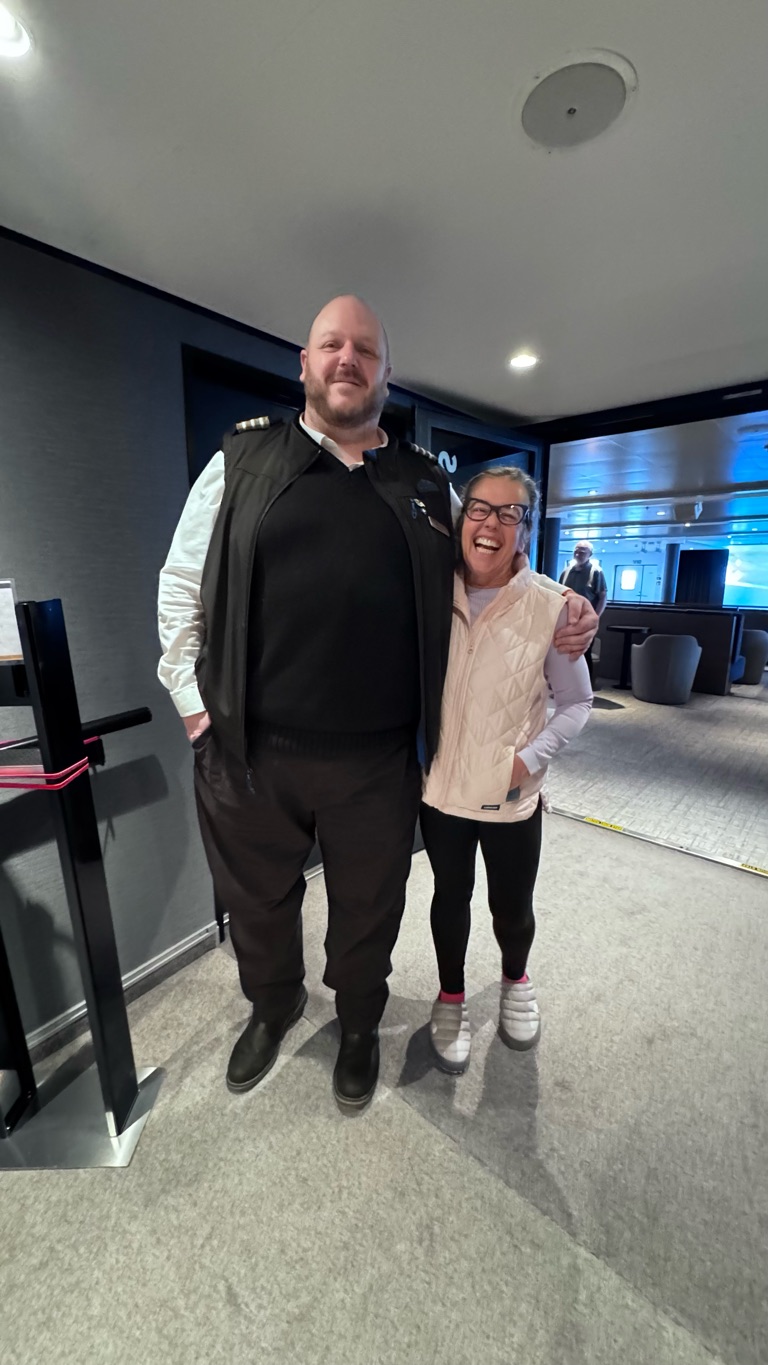 The expedition staff make it a point to dine with passengers as often as possible. If seated at a four or six person table, it’s not unusual to have one or more expedition staff ask to join you for breakfast, lunch, or dinner. Darren, the hotel and food service manager, picks individual passengers to host for a special dinner. He’s an extremely large man from Northern England that, because of his size and brogue, at any moment you would expect him say “get in my belly”!! He and Mary made a connection over, of all things, powdered sunblock. She accidentally left her powdered sunblock in one of the life preservers and he happened to be at the reception desk when she went to report it missing. He was intrigued that there was such a thing as powdered sunblock. Subsequent to the conversation, he invited us to have dinner with him and his fiancé whom he proposed to at the start of this cruise. Based on his size, in contrast to Mary, I posted on FB that in Antarctica, big things eat little things. I kidded I was afraid we would be on the menu.