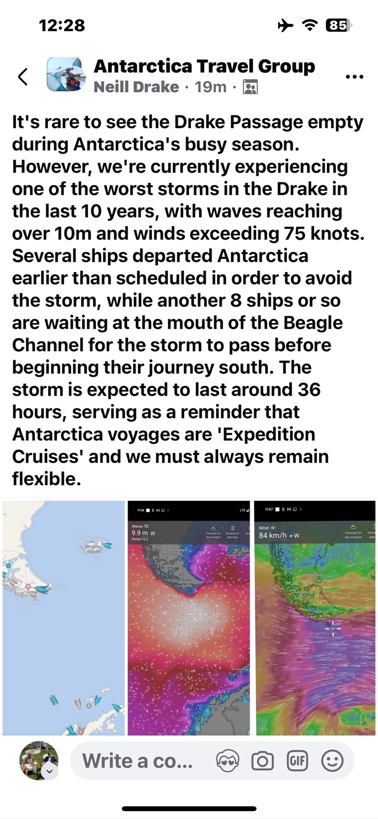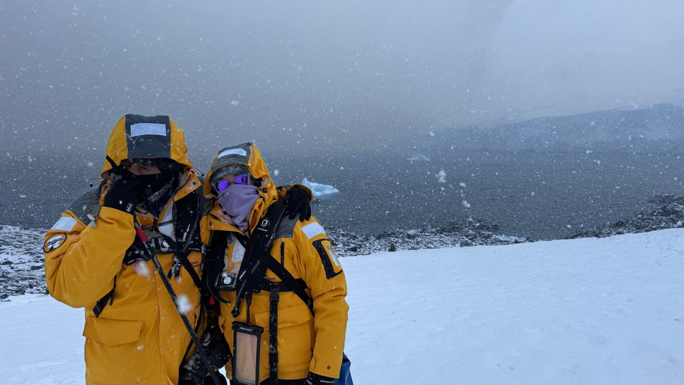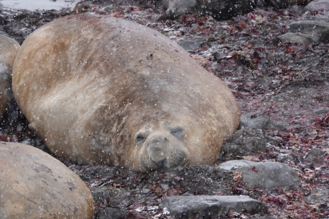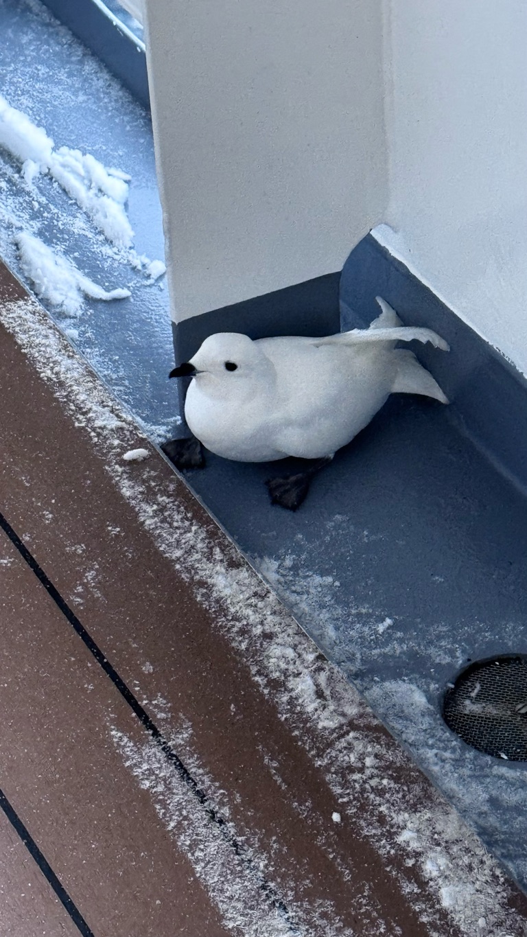 We were again up early Wednesday morning in hopes of seeing another glorious sunrise. However, instead of a pastel colored sky, we were treated to a beautiful snowy morning. Crew members were out shoveling decks and exterior furniture was blanketed with a beautiful coat of fluffy snow. As we walked the promenade deck, \240we spotted Jaqui, a young Aussie woman we met earlier, with \240her camera trained on something on the ground. As we approached, we saw a beautiful \240bright white snow petrel with its dark blue webb feet, huddled next to a deck rail. Attracted \240to light, they occasionally land on decks, however, they lack the space to take off again. Luckily Fabrice, the residents ornithologist picked up the little bird and helped it take flight again.