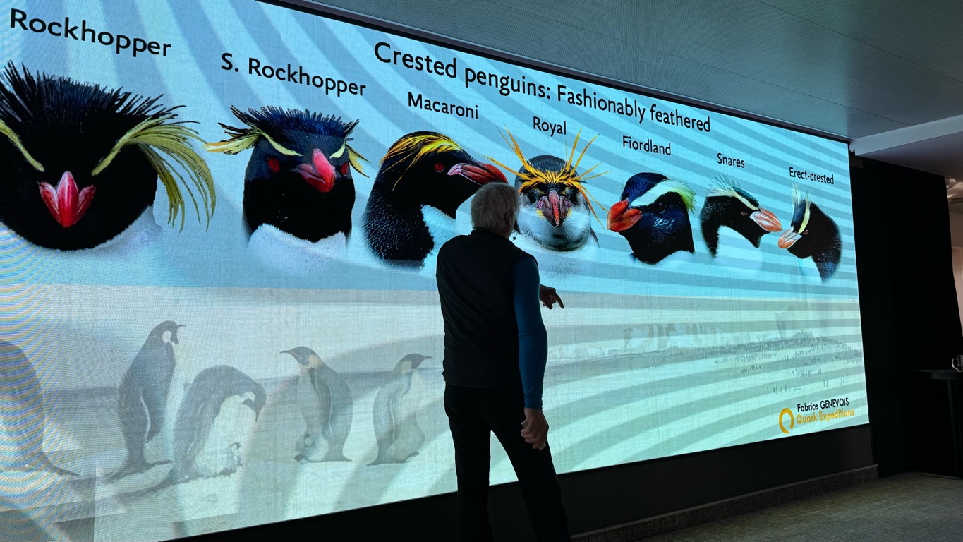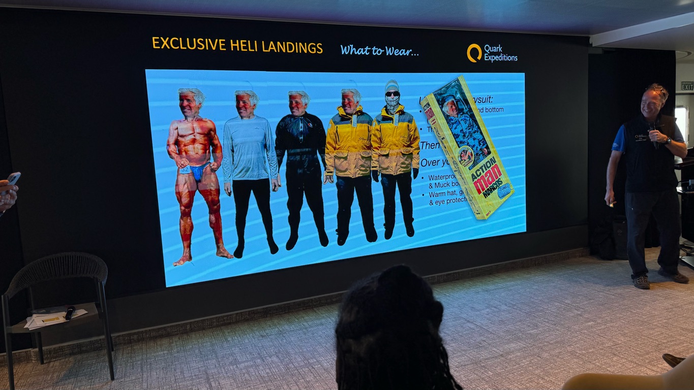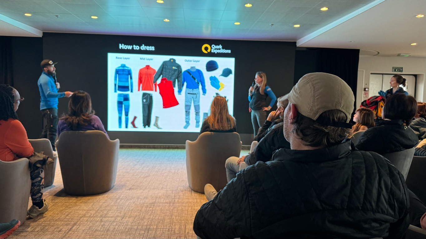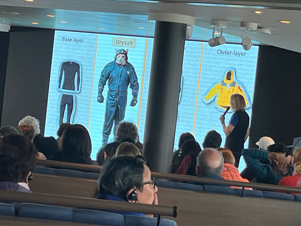 The two divisions that most impacted us were hotel and culinary, and the expedition team. If you’ve cruised or were a fan of “The Love Boat” you know cruise ships have a cruise director, hence Julie on The Love Boat. In contrast, expedition ships have expedition leaders instead of cruise directors. The expedition leader formulates a schedule of events, participates in expeditions and leads a daily briefing for all passengers. Daily briefings cover the day’s activities, the subsequent day’s schedule and usually, a scientific lecture of some sort by a resident expert.