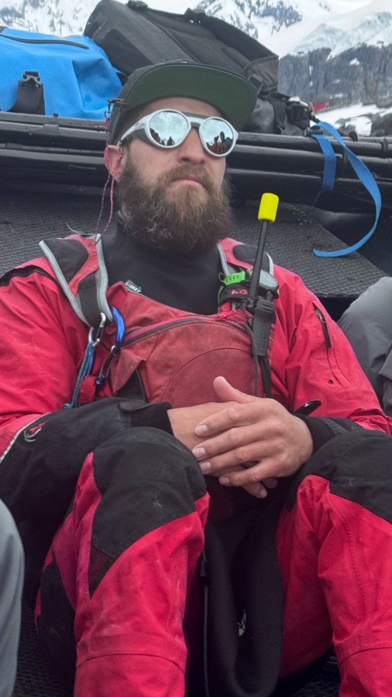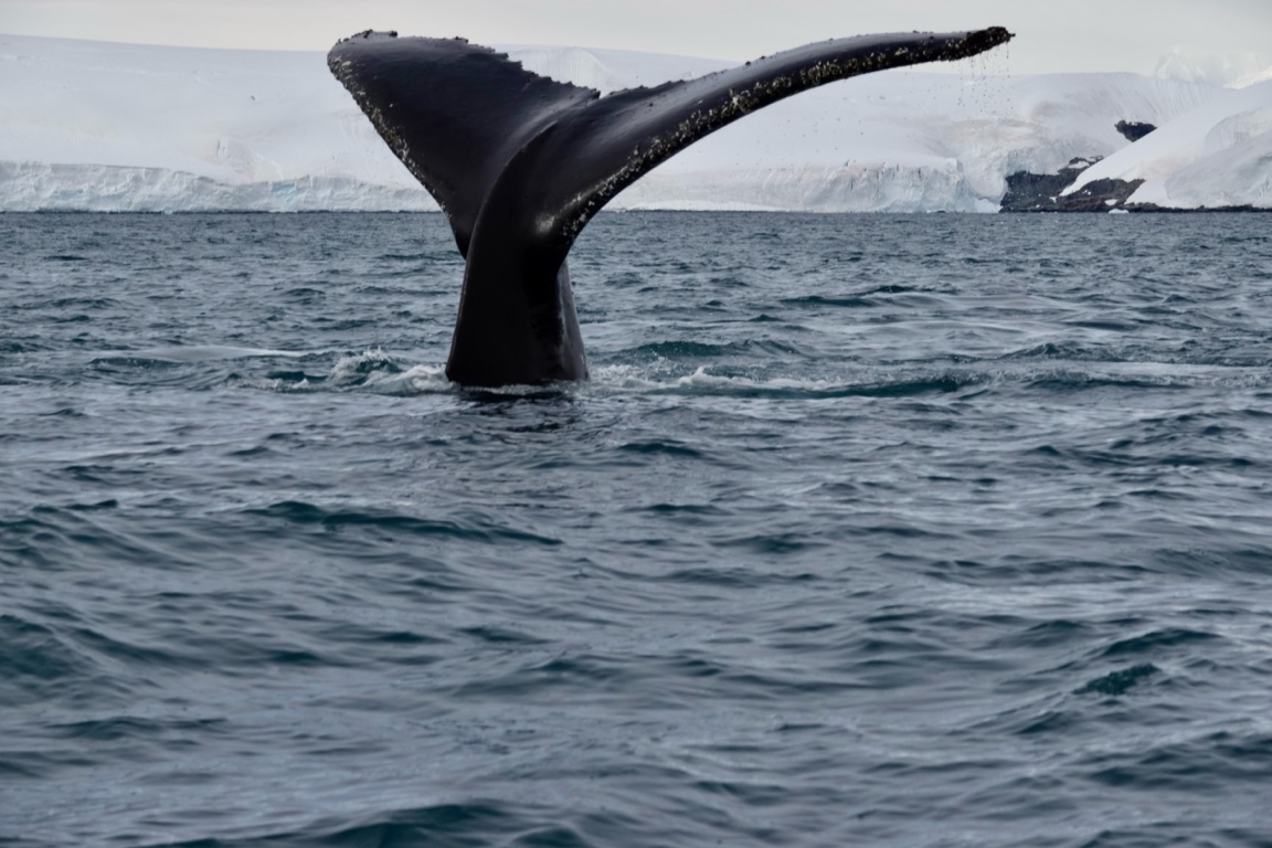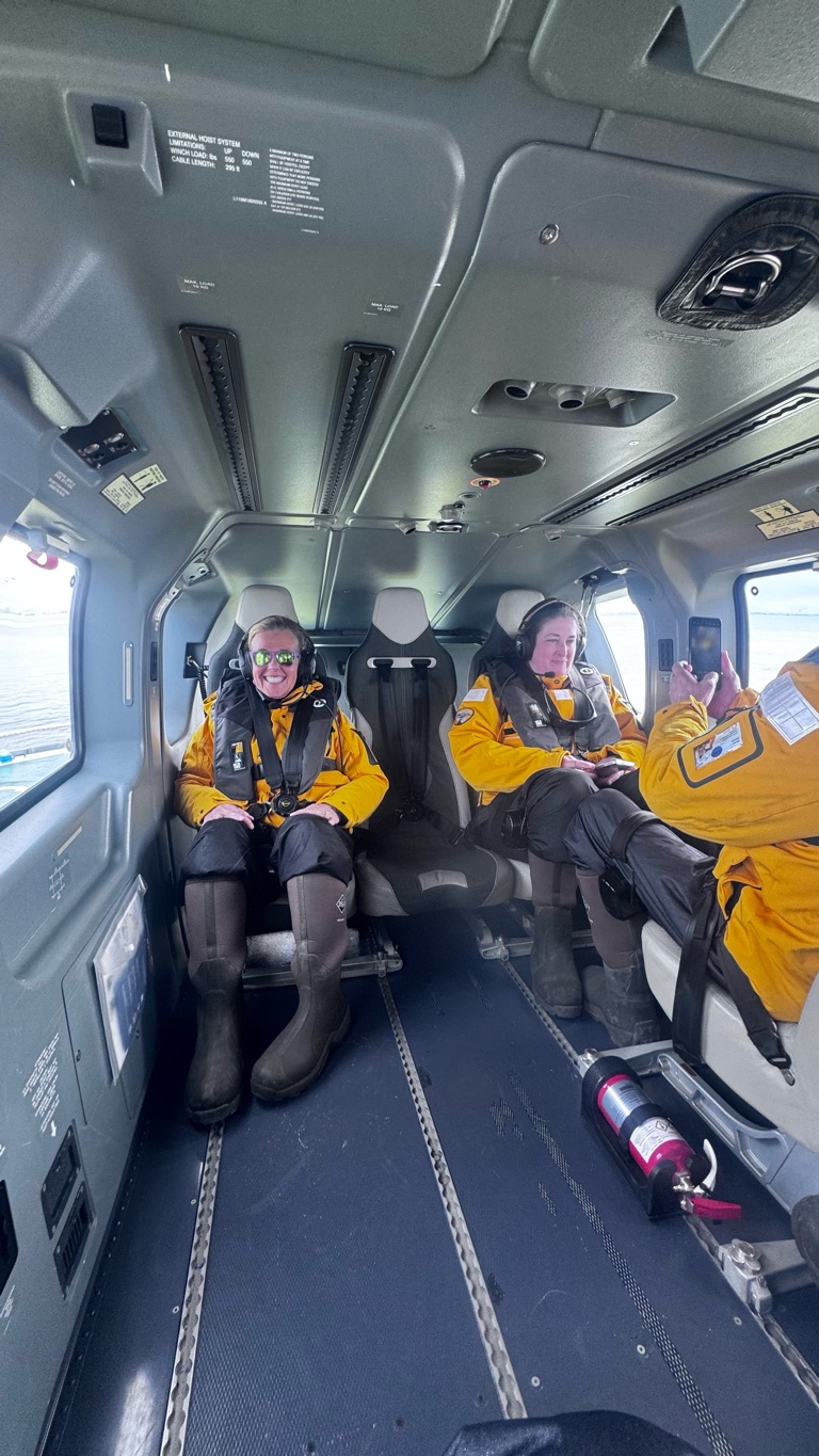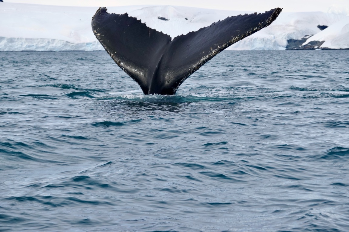 That morning, the Albatros and Penguin groups readied themselves for the morning’s helicopter ride, while the Seal and Whale groups went on zodiacs in search of whales and seals. After lunch, the Seal and Whale groups prepared to go on the helicopter, while Albatros and Penguin groups toured on the zodiacs. The whales were extremely active that day, prompting our guide Amalia to note this was the most whales they had seen all season. In preparation for our helicopter ride, we had to dress in a dry/ flight suit and proceed to a staging area. There you were put into groups of six or seven. Once assigned a group, you moved to a pre-boarding area to receive your seat assignment and finally up to the flight deck. You were loaded onto the helicopter with military precision and immediately two staff members jumped in to secure your waist and shoulder harness. Both of the helicopters were piloted by former British Royal Navy pilots. Although relatively short, the trip was exciting and amazing. At one point the pilot asked everyone on board to set their phones to video, as he rotated the helicopter inside of a gorge. The result was a 360° view of the gorge and the surrounding glaciers.