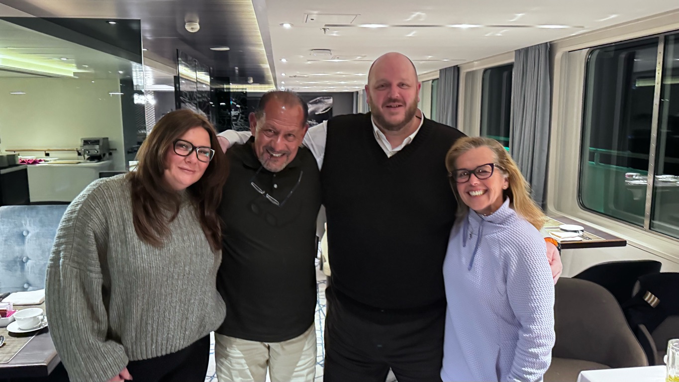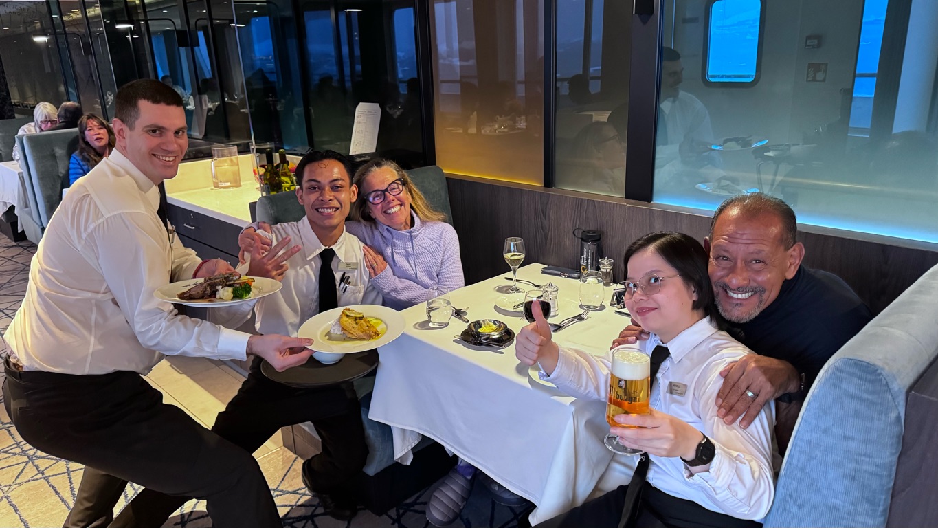 After Wednesday’s briefing we joined Darren and his fiancé Laura dinner. They met online while Darren was recuperating from an illness. This will be their second marriage and coincidently, they didn't live too far from each other. Darren was a bartender who was recruited to work on a cruise ship. As fate would have it, he was promoted to beverage manager and eventually to hotel and culinary manager. He is very fond of Jake and Captain Yuriy, who he’s known for years. The difficult part of his relationship with Laura is his travel schedule. She is the HR director for a health group in England and is a stabilizing force with their three girls. \240They are absolutely adorable with each other. He’s a former rugby player and in college, he played American football. He’s a huge Kansas City fan, and ironically, Laura is a Philadelphia Eagles fan. As such, the latest Super Bowl wasn’t a complete disappointment for them. As Americans, it’s embarrassing how little we know about other countries. Darren and Laura weren’t only knowledgeable about our politics, they knew more about American sports than we did. As the night went on, bottles of wines flowed, and sometime after dinner, a bottle of Scotch was cracked. Our beverage Stewart Jhon (yes, pronounced John), one of Darren’s protege’s, never allowed the wine glasses to empty. After a delicious dessert, Jhon brought out mugs of beers. That’s when the evening became a one eyed haze for me. \240For those who know, \240you know what it means to get Daved. \240Well, I got Daved by the very large Darren. A crucial lesson — never try to match a giant, drink for drink. \240Luckily, the burley but effervescent Polish head maître d, named Peter, helped me (as Stan would say) put one foot in front of the other and guided me back to our stateroom. Otherwise, like Ray-Ray, I would have slept on some deck in the fetal position. \240The next morning I was afflicted with cotton mouth and brain fog; Peter was kind enough to made sure I felt better.