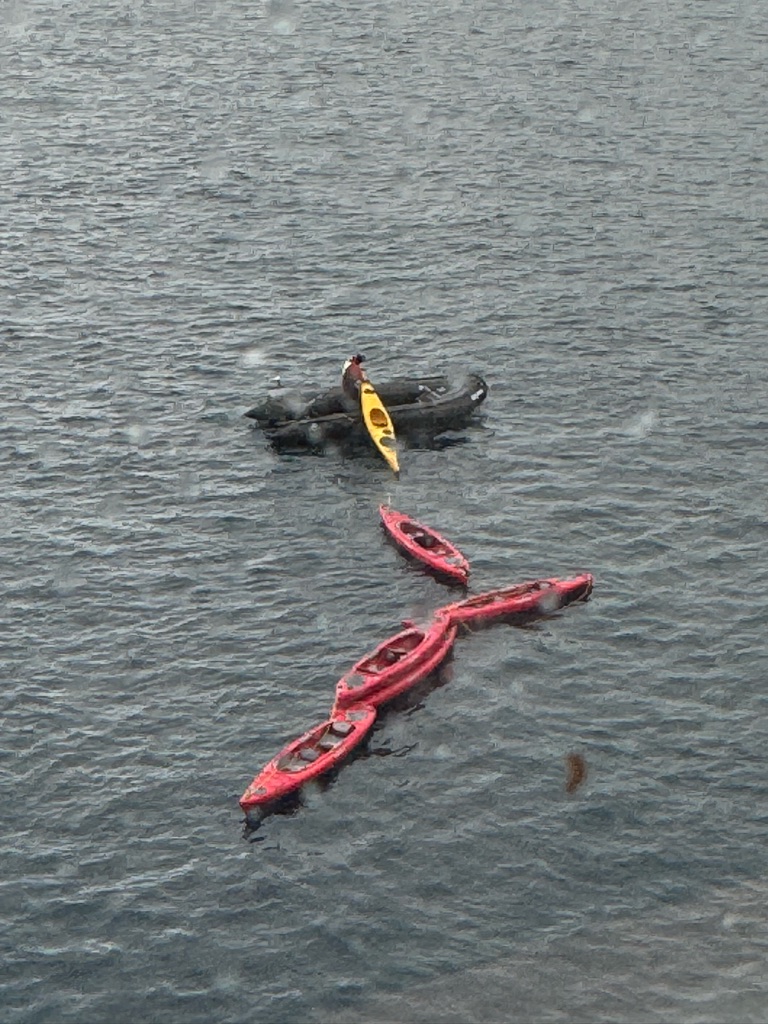 Weather has turned for the worst. Kayakers and guests along with expedition team have been rescued by zodiacs as they could not get back to ship.