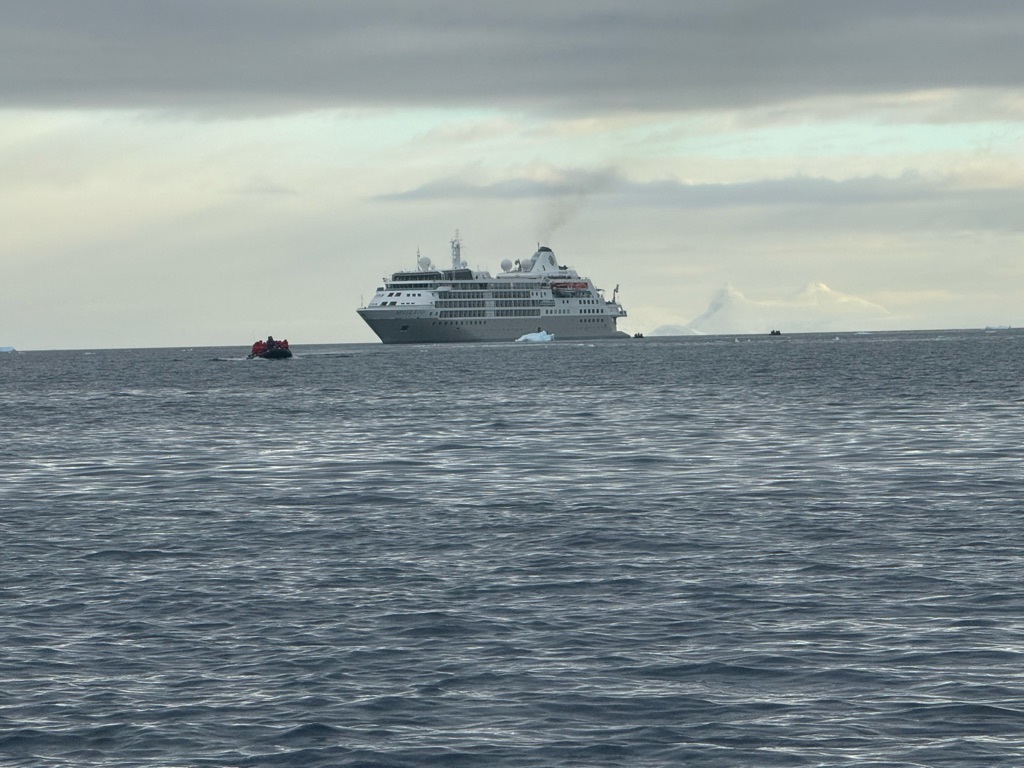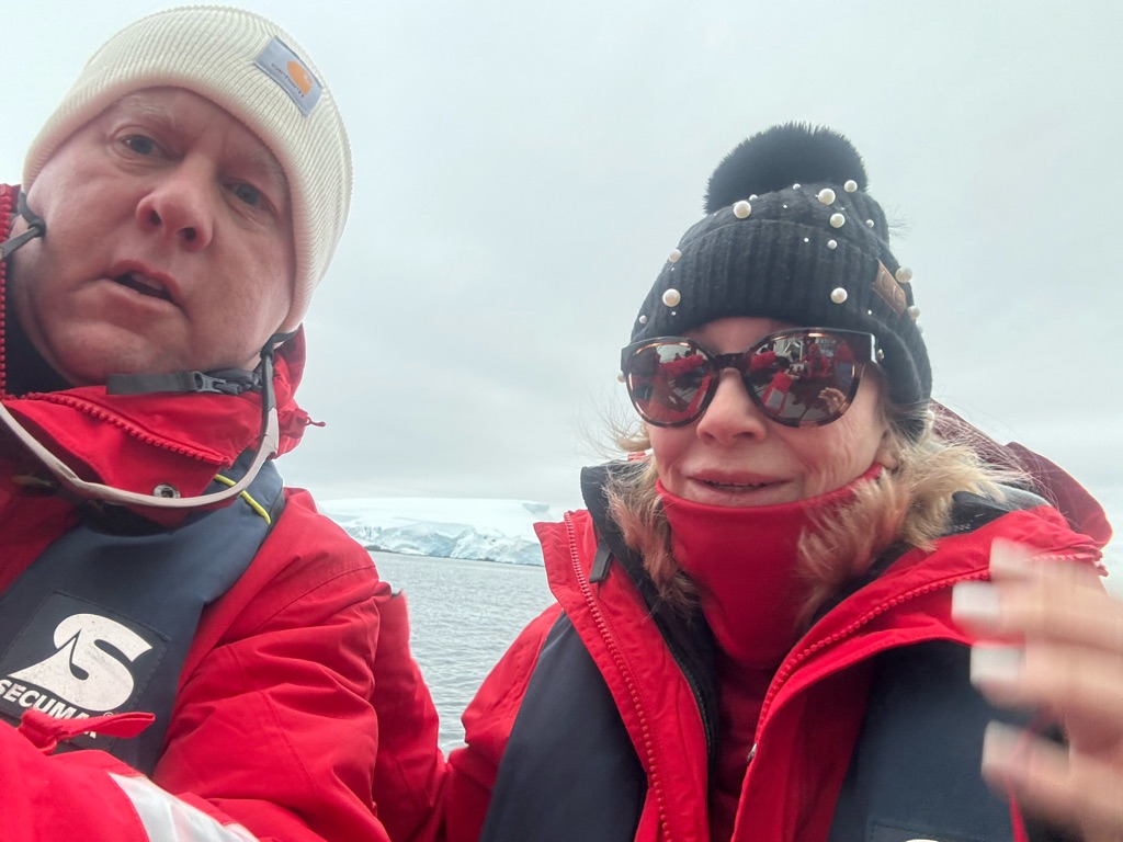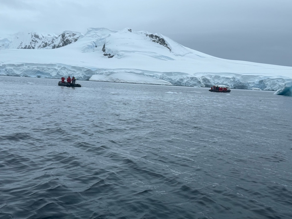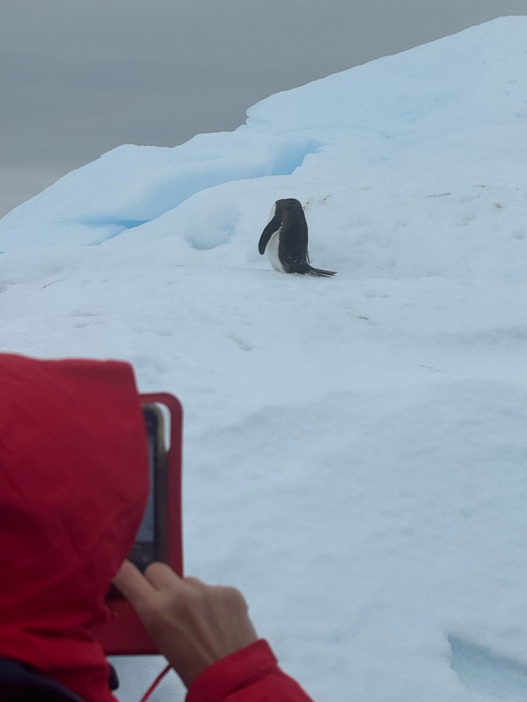 We’ve arrived in Atarctica! \240We got all geared up in our polar equipment and waddled down to the zodiacs for a tour of the icebergs and \240glaciers in this lille bay. \240