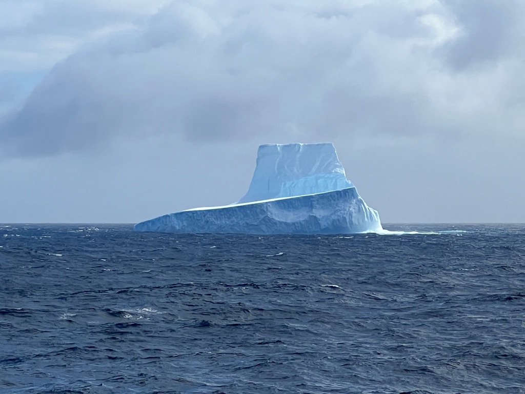 On the second day when we were about 3 hours from entering the calm waters around Antarctica, we encounter our first iceberg. \240From this angle it resembles a military boat.