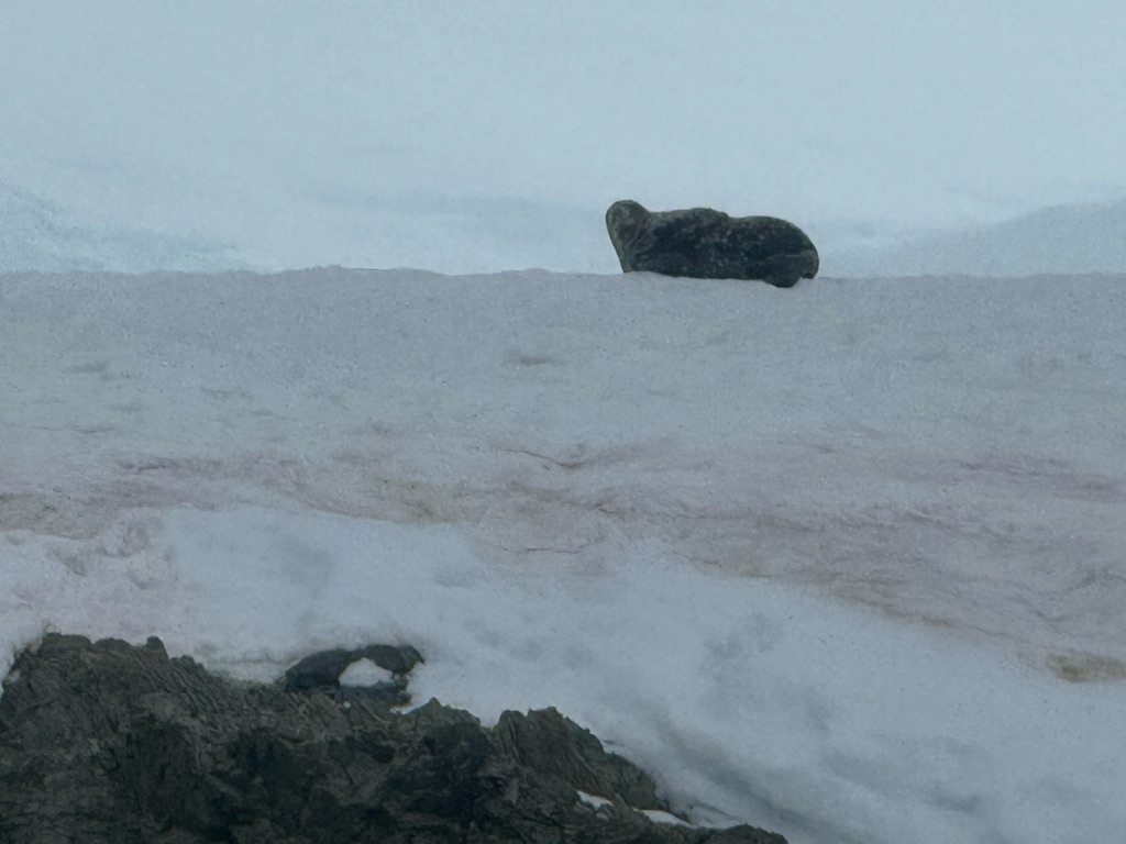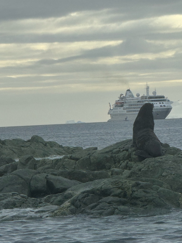The first seal we encounteted is the \240 \240Weddell seals. They measure about 8ft 2 in – 11 ft 6 in long and weigh 880–1,320 lb). They are amongst the largest seals, with a rather bulky body and short fore flippers relative to their body length. Males weigh less than females, usually about 1,100 lb) or less. Male and female Weddell seals are generally about the same length, though females can be slightly larger.Weddell seal face has been compared to that of a cat due to a short mouth line and similarities in the structure of the nose and whiskers The Weddell seal grows a thin fur coat around its whole body except for small areas around the flippers. The colour and pattern of the coat vary, often fading to a duller colour as the seal ages This coat moults around the beginning of summer Adults show a counter-shaded colouration that varies from bluish-black to dark grey dorsally and to light grey/silver ventrally. Coats may change to shades of brown before the annual moult. Adult males usually bear scars, most of them around the head. \240 Unfortunately, we didn’t get close enough to this one to make our many of the features. But we learned all about Antarctic seals during one of our on board lectures.
