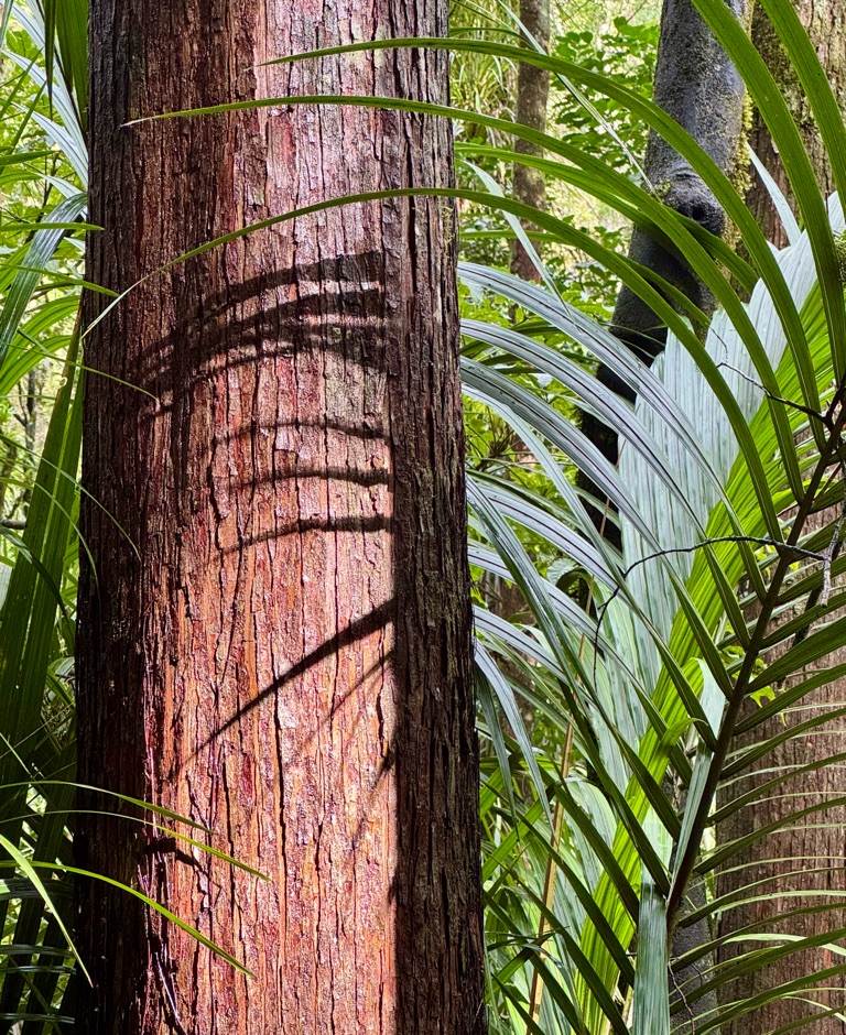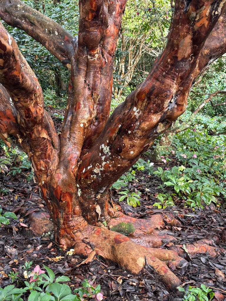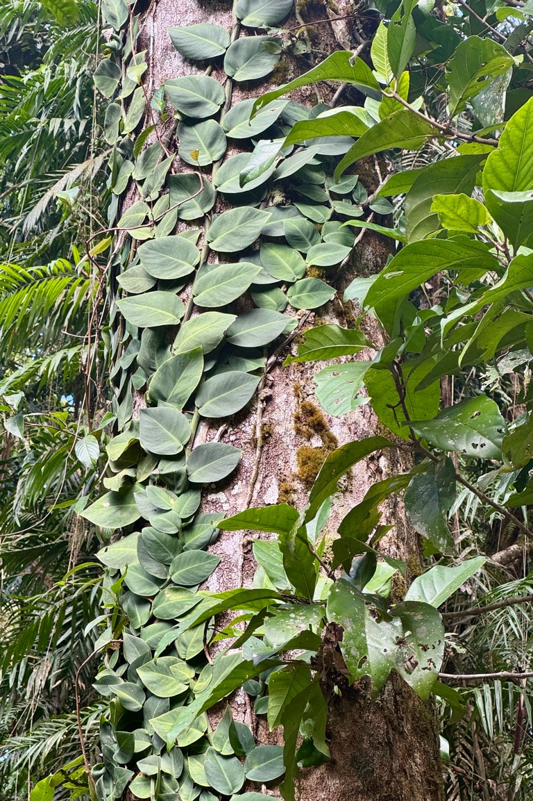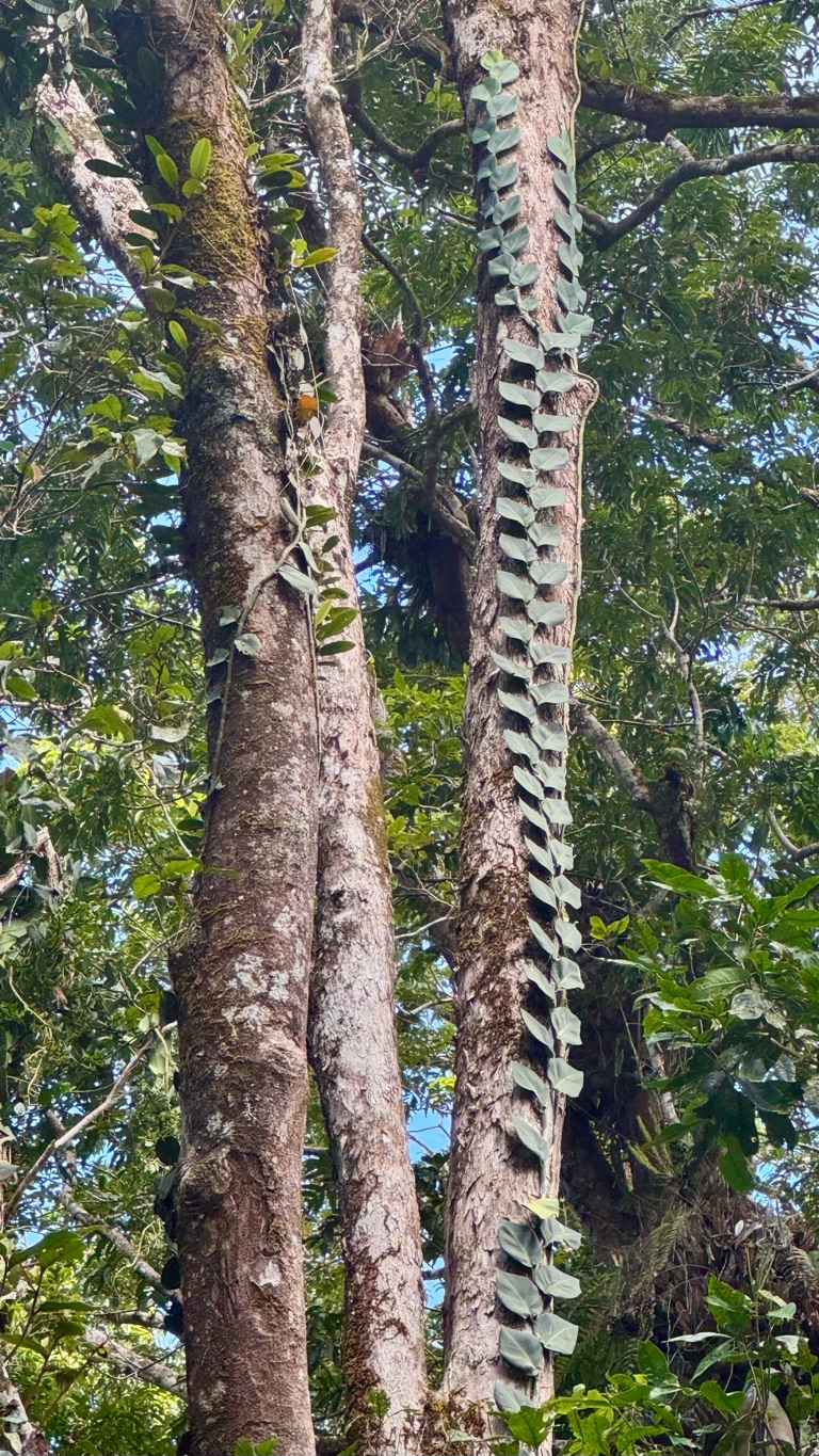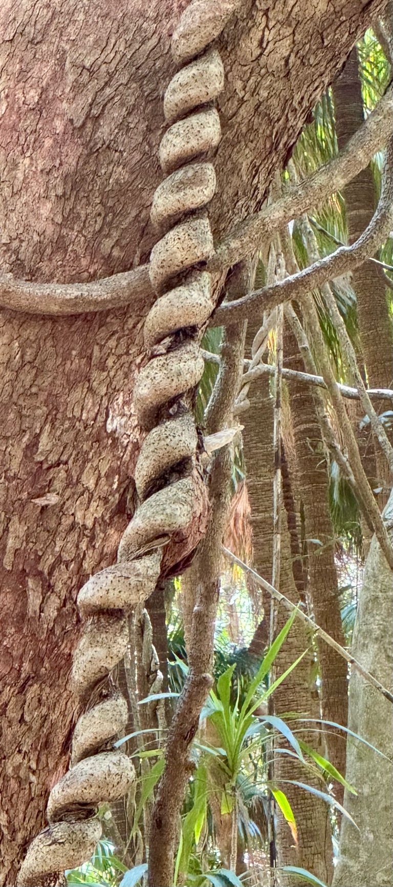 This is a strangler fig that climbs down or up a host tree and eventually surrounds and kills it. The original tree is the darker bark. It’s a plant eat plant world!